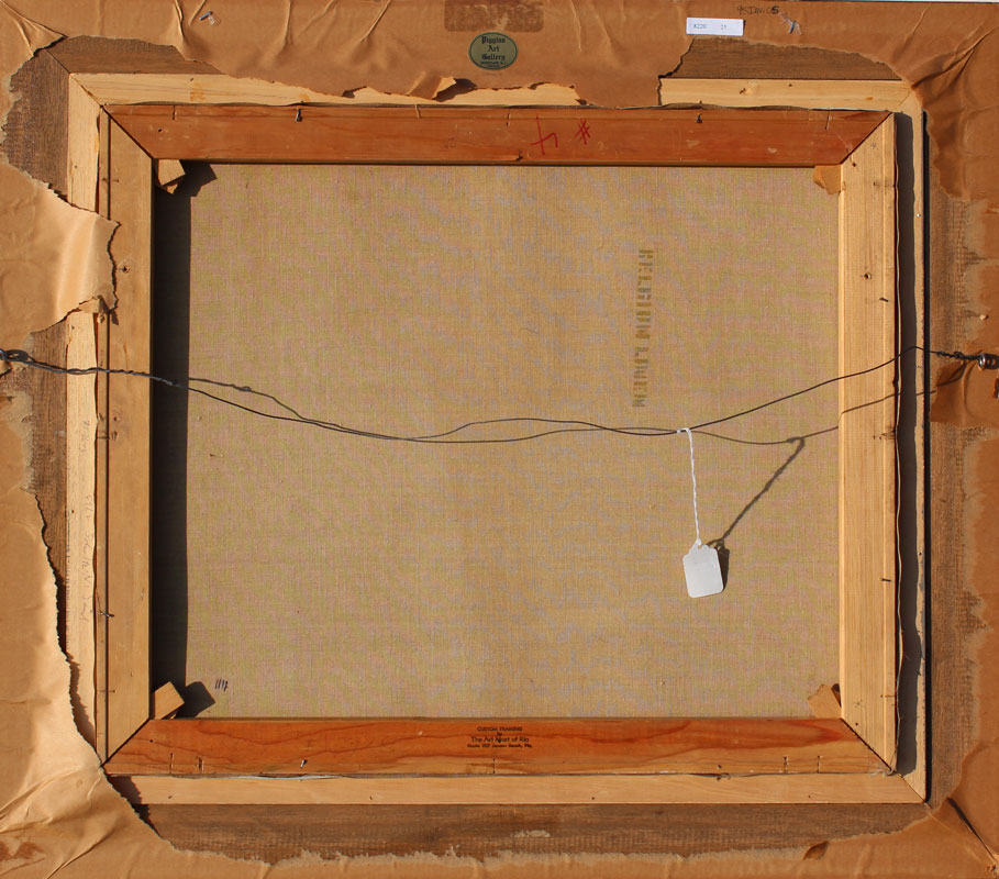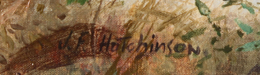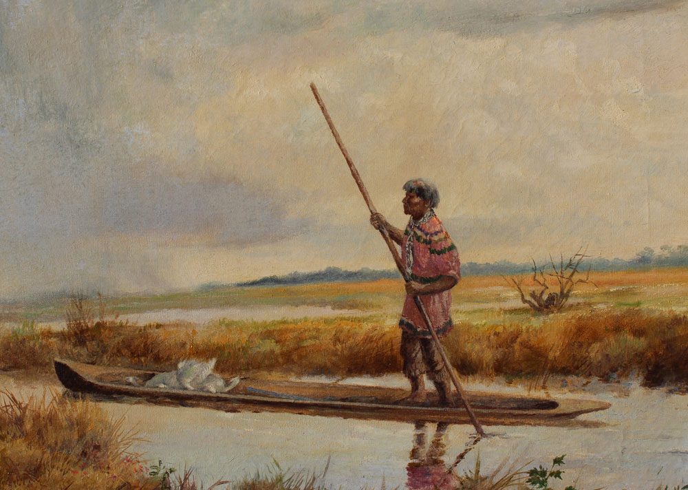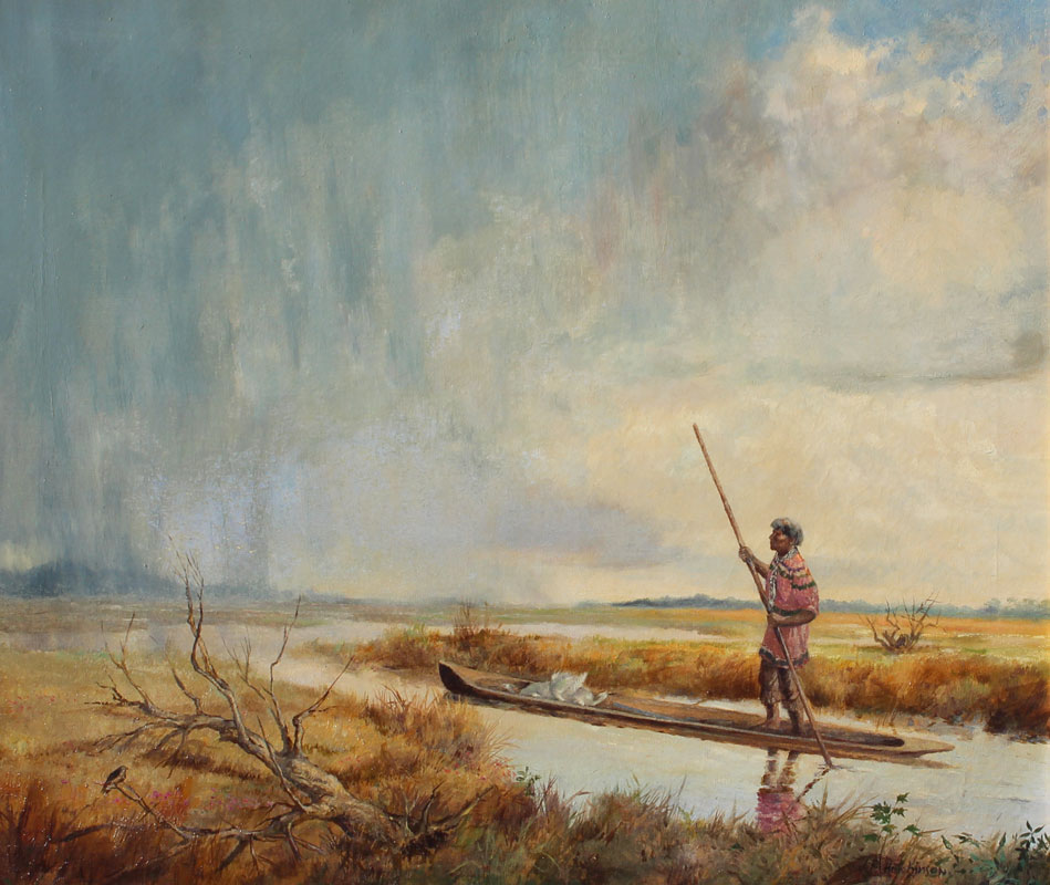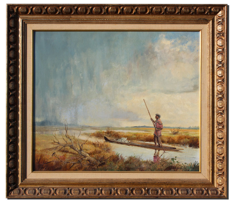 HUTCHINSON, James, (American, 1931-): ''Plume Hunter'', American Indian Poling His Canoe in a Marsh With Storm Approaching, Oil/Canvas, 20'' x 24'', signed lower right, gilded and carved frame, 27'' x 31''.