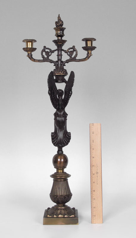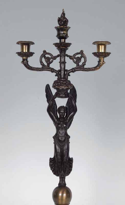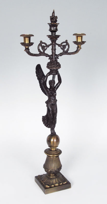 FIGURAL 3 LIGHT BRONZE CANDELABRUM: 20th Century, 3 light candelabrum with winged maiden on ball with pedestal base. Unsigned. 25 1/2'' h. x 9 1/2'' x 4 1/4''.