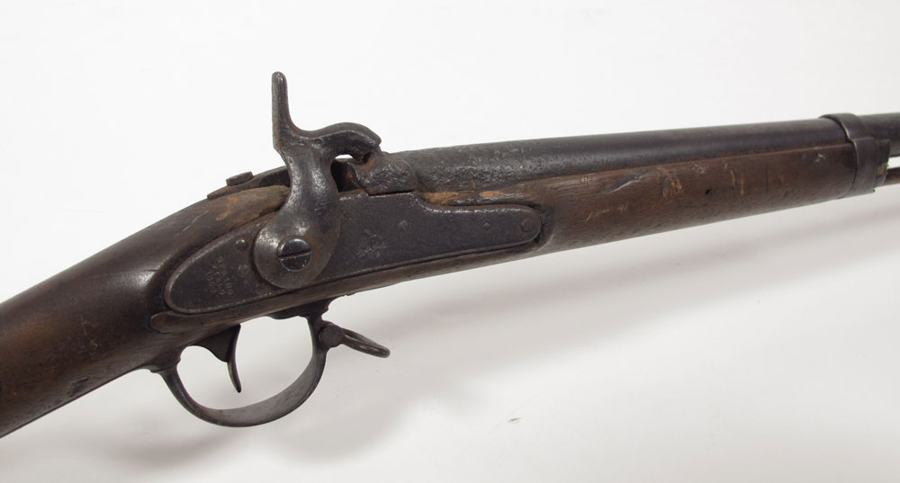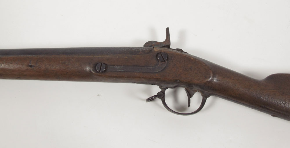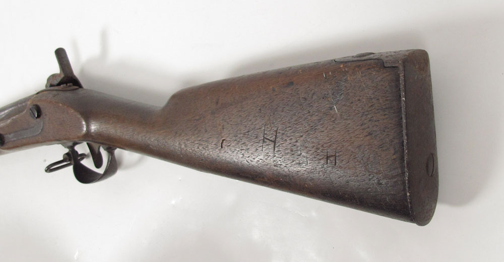 RELIC SPRINGFIELD MODEL 1842 PERCUSSION MUSKET: Model 1842 percussion marked Springfield and dated 1850. Stock has been altered, cut down and barrel rings added to hold replacement rod. .69 caliber 42'' barrel. Several different owners initials hand carved into stock. Action is currently functioning. Overall 57 3/4'' l. overall.