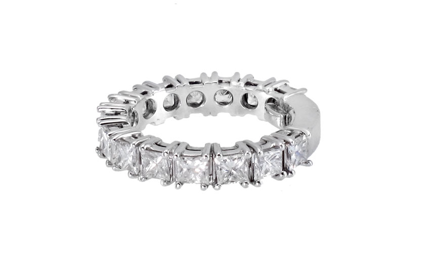18K GOLD WEDDING BAND WITH 15 DIAMONDS: Fifteen square brilliant cut diamonds, totaling approx. 2.25 Ct., averaging VS in clarity and G-H in color. The diamonds are prong set. Sizing cleats inside of shank. Weight: 4.2 grams. Size: 5