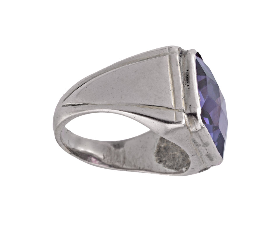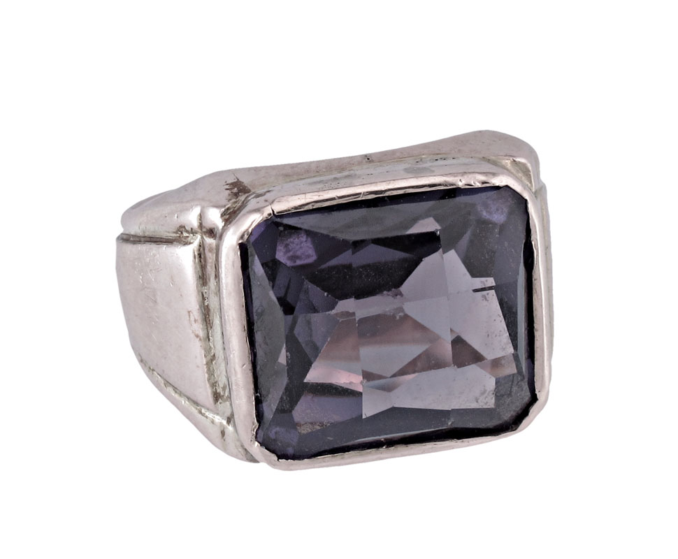 14K GOLD SYNTHETIC COLOR CHANGE SAPPHIRE RING: 14K yellow gold ring contains one rectangular mixed cut synthetic color-change sapphire. Weight: 10.00 Ct. Approx. The sapphire is bezel set. Weight: 9.1 Size: 7.25