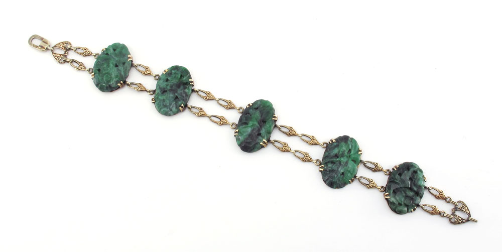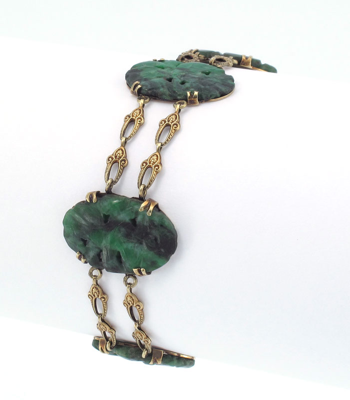 14K GOLD CARVED JADE PANEL BRACELET: 14K yellow gold bracelet of 5 oval pierce carved panels of nephrite jade. 7.5'' length. 7/8'' wide.