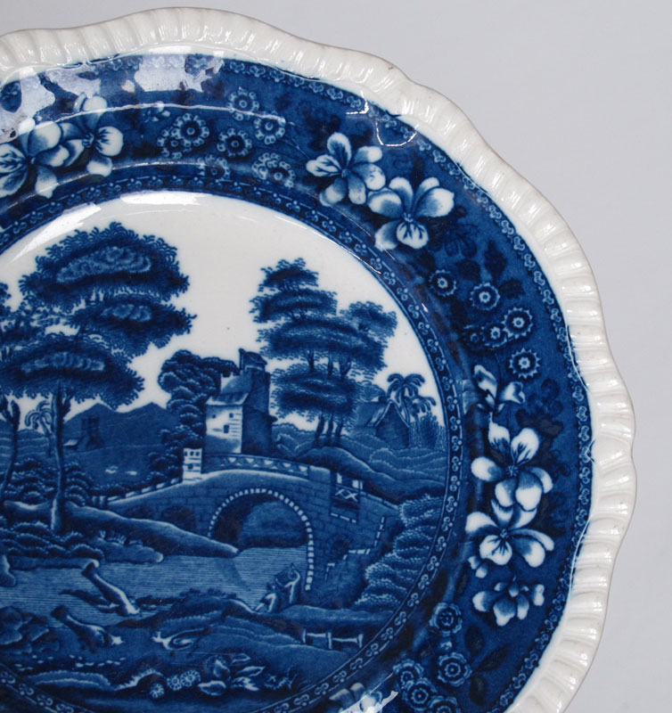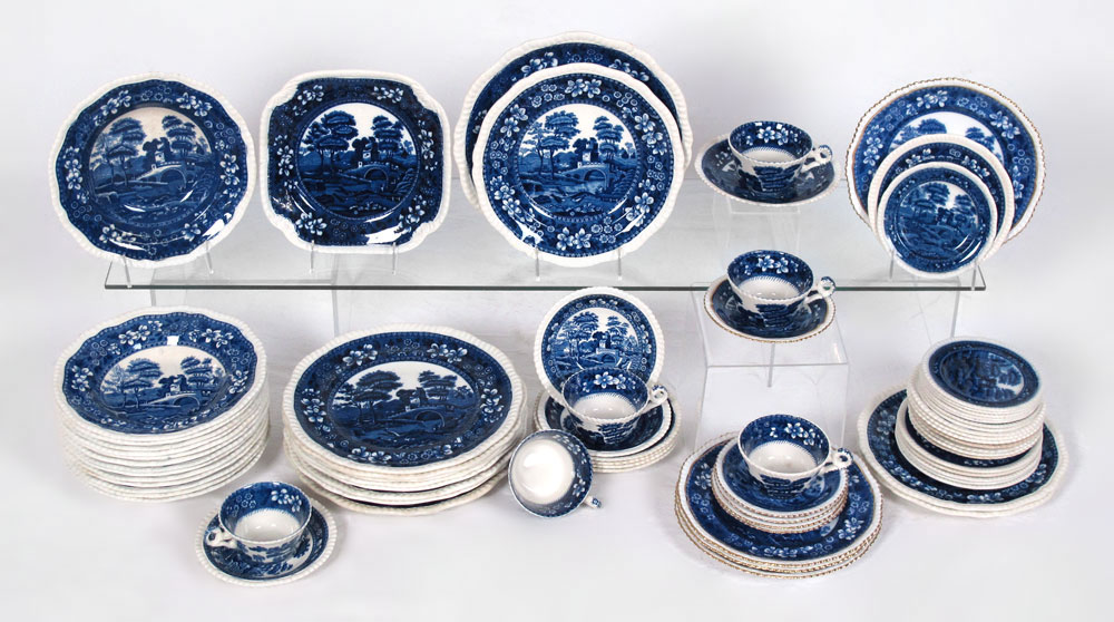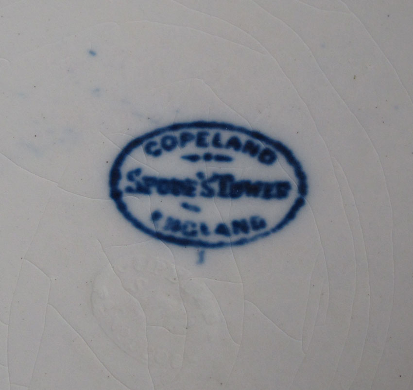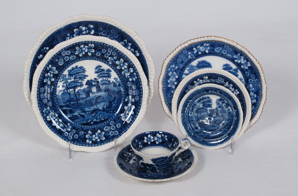 COPELAND SPODES TOWER BLUE CHINA: To include 10 dinner plates (10 5/8''), 3 luncheon plates (9 1/4''), 6 bread and butter plates (6 3/8''), 8 small bread and butter plates (5 1/2''), 14 rimmed soup bowls (9 1/4''), 6 cups (2 1/8''), 9 saucers, 5 over sized saucers (4 3/8''), 1 square salad plate (7 3/4''). Sold with 4 gold rimmed luncheon plates (9 1/4'') and 5 gold rimmed saucers