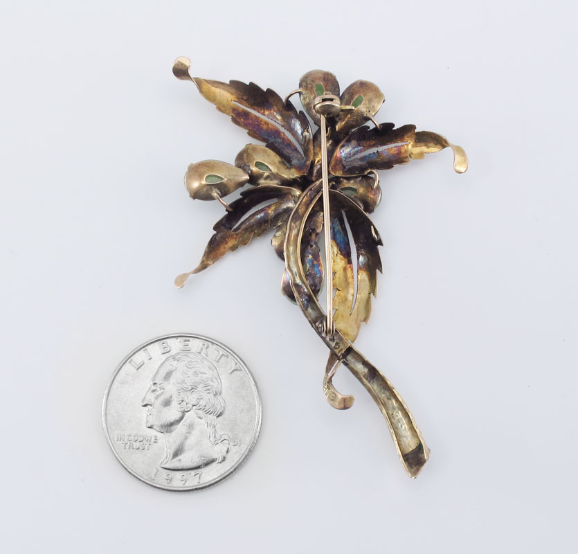 14K GOLD JADE FOLIATE BROOCH: 14K yellow gold botanical figural broach contains 9 nephrite jade cabochon cut stones. Length 2.5''. Weight 8.9 grams.