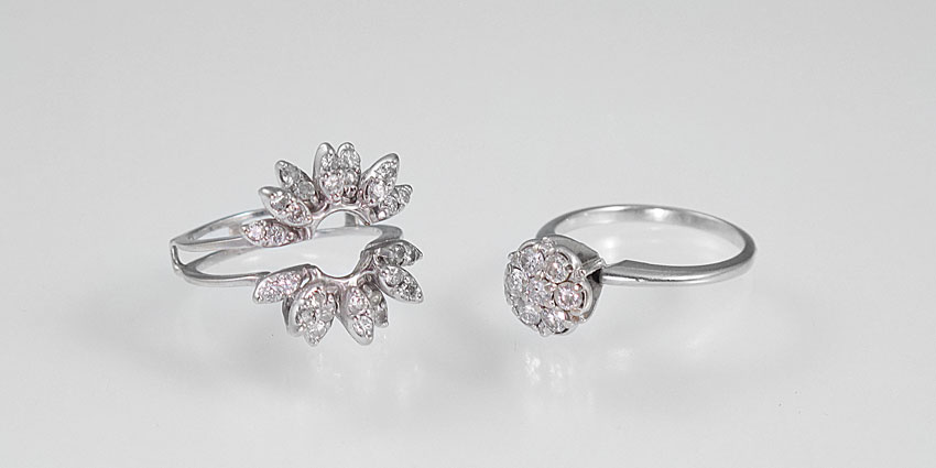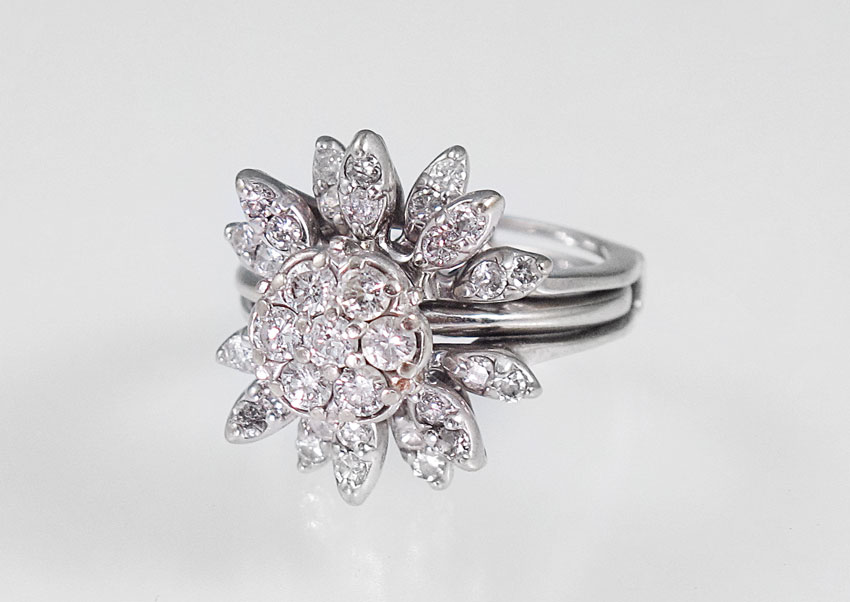 14K GOLD DIAMOND ENGAGEMENT BRIDAL RING SET: 14K white gold bridal set contains 35 round full cut diamonds. Weight: 1.00 Ct. Approx. The diamonds average SI in clarity and H-I in color. The diamonds are prong set. Weight: 8.5 grams. Size: 6.5