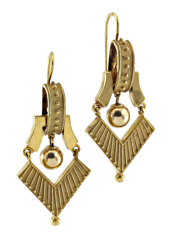 14K GOLD ETRUSCAN STYLE GOLD DANGLE EARRINGS: 14K yellow gold earrings of Victorian design. Articulated pieces with shepherds hook closures. Weight: 10.6 grams.