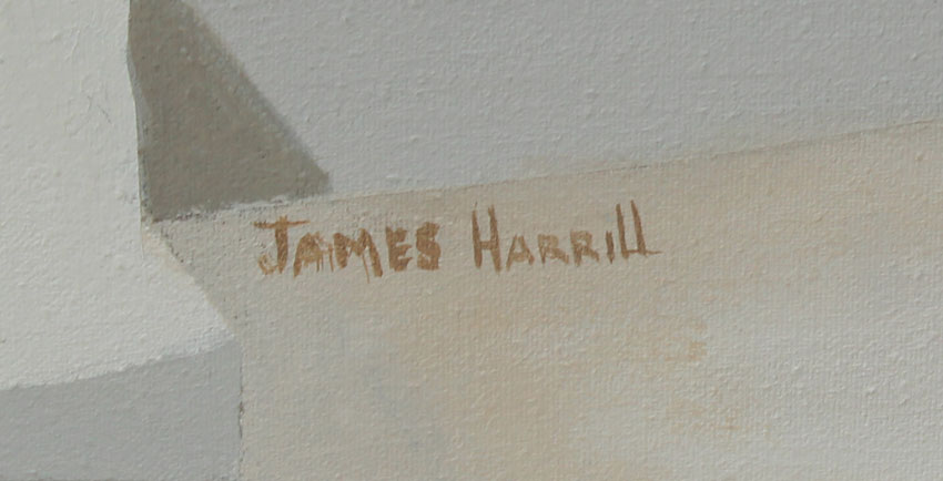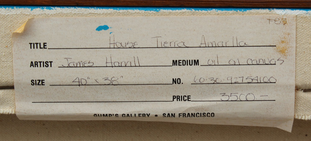 HARRILL, James, (American, 1936-1996): ''House Tierra Amarilla'', OIL/Canvas, 38'' x 40'', Gump's San Francisco gallery label verso with price tag of $3500.