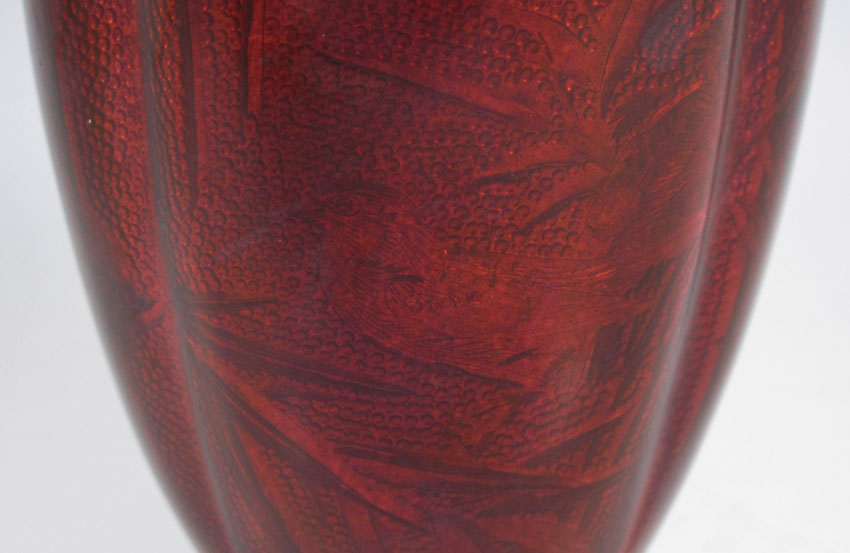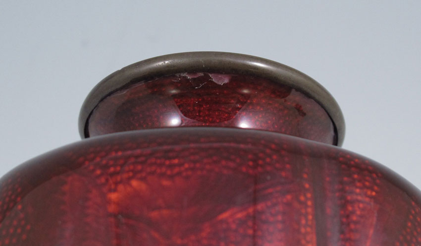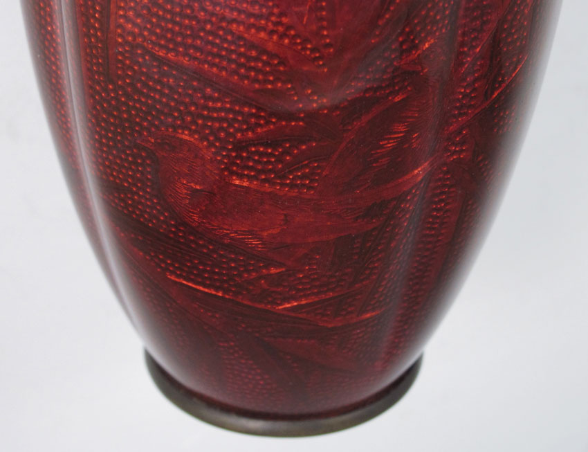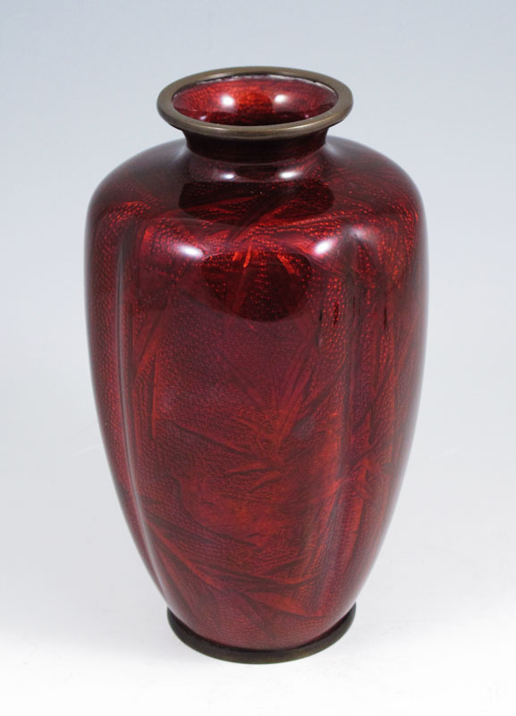 JAPANESE PIGEON BLOOD GINBARI CLOISONNE VASE: Bamboo design on ribbed body, 7'' h x 4 1/4''.