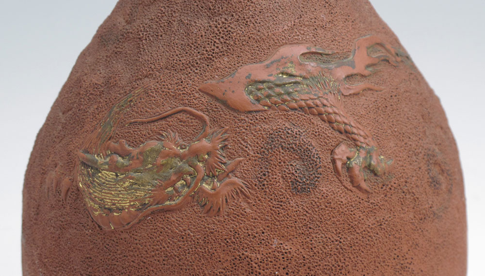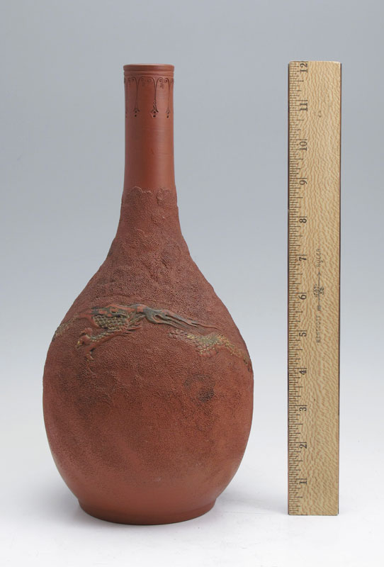 JAPANESE REDWARE DRAGON VASE: Bottle neck vase, parcel gilt, 12'' h.