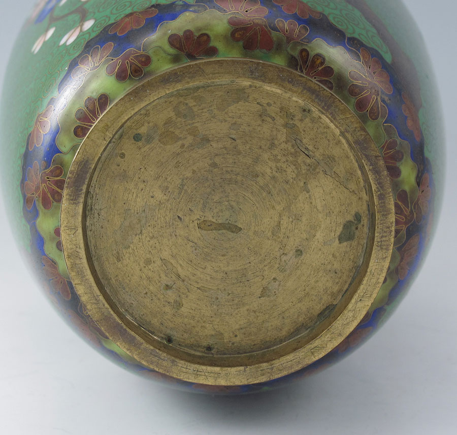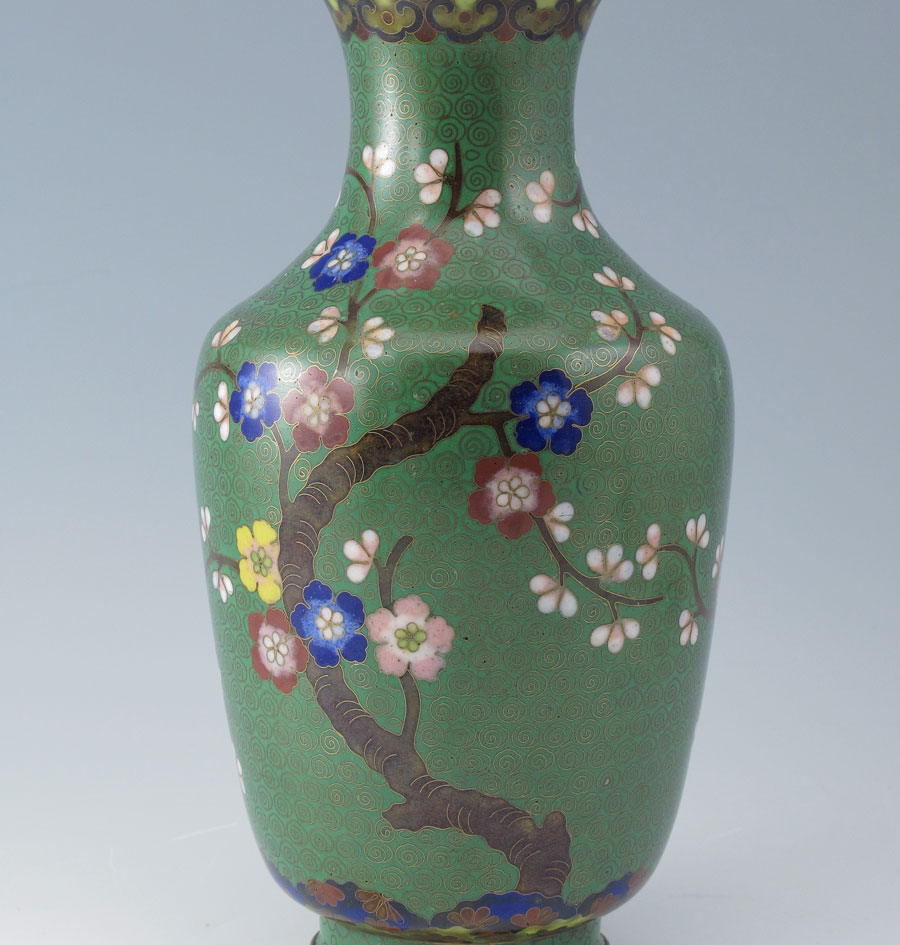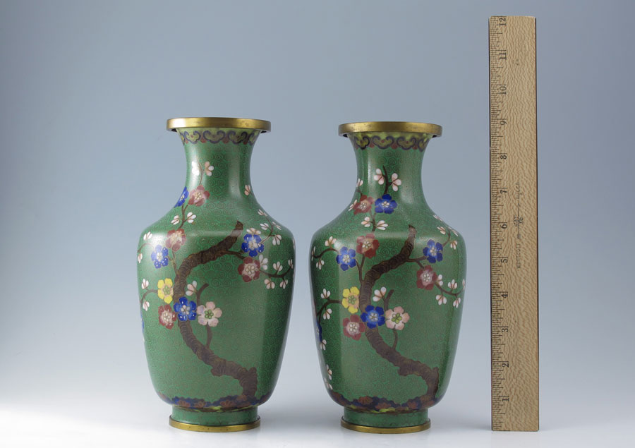 PAIR CHINESE CLOISONNE VASES: Blossom filled trees on green ground, brass. 9''h.