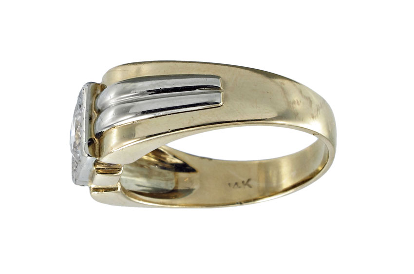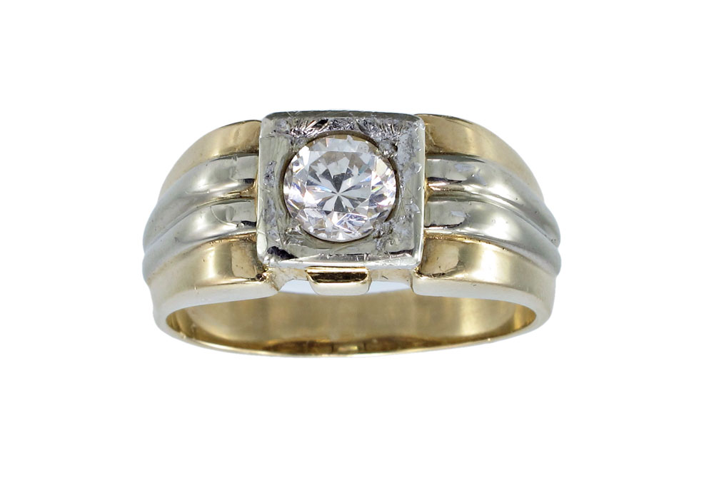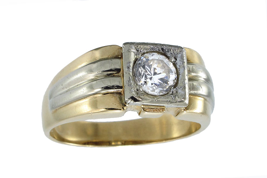 GENTS 14K GOLD RING: 14k two tone ring contains one 5.50 mm CZ. Weight: 9.0 grams. Size: 12.5