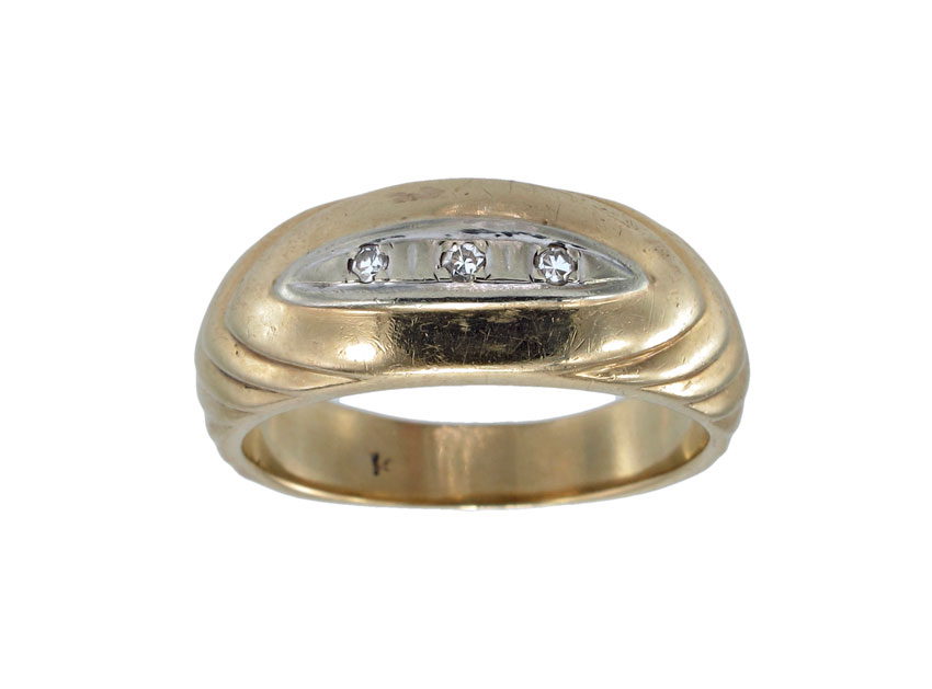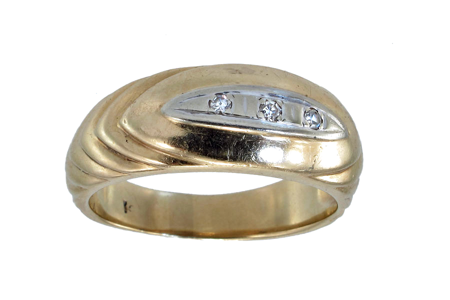 14K GOLD DIAMOND WEDDING BAND: 14K yellow gold band contains three round single cut diamonds. Weight: .06 Ct. Approx. VS in clarity and G-H in color. The diamonds are deep set. Weight: 6.7 grams. Size: 9.5