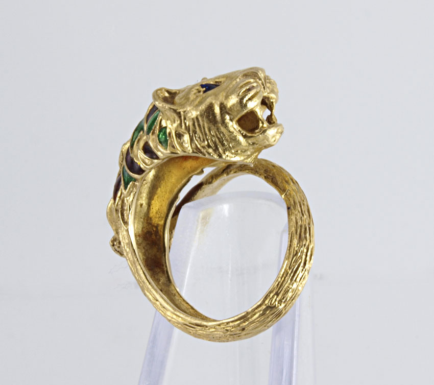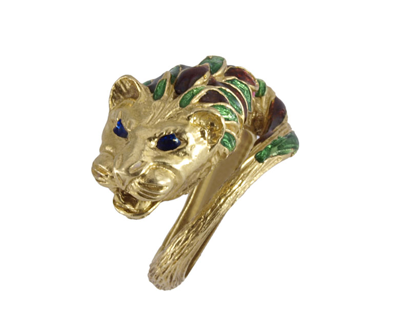 14K GOLD ENAMELED FIGURAL TIGER RING: 18K yellow gold ring contains two 1.00 mm synthetic sapphires. Red and green enamel decoration. Weight: 12.0 grams. Size: 4.5