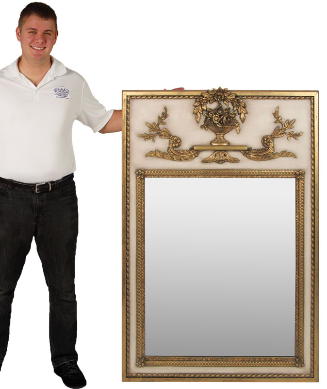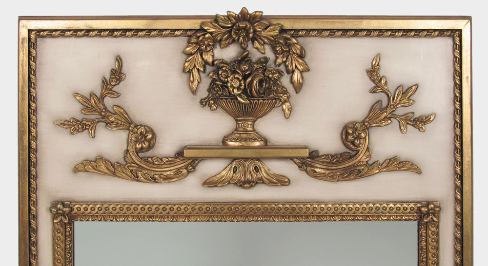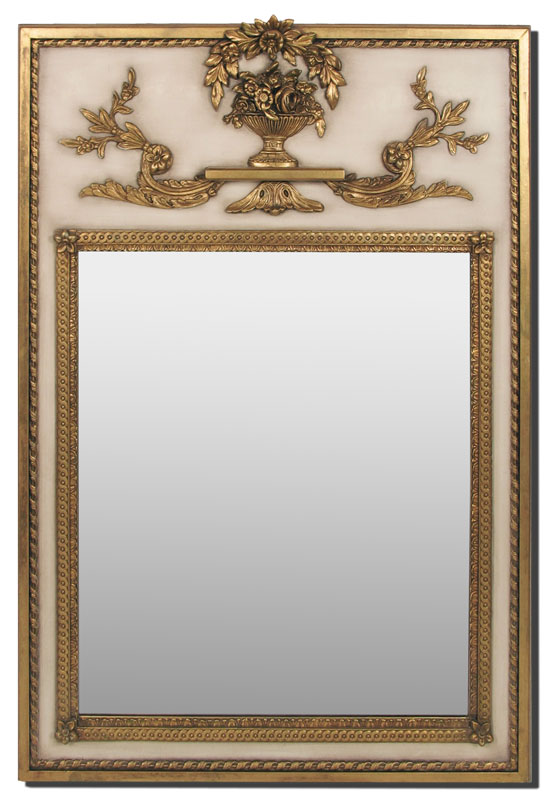 PAINTED AND PARCEL GILT TRUMEAU MIRROR: The upper section with flower filled urn. Measures 53'' tall x 37 1/2''.
