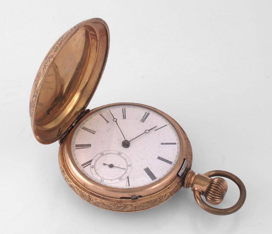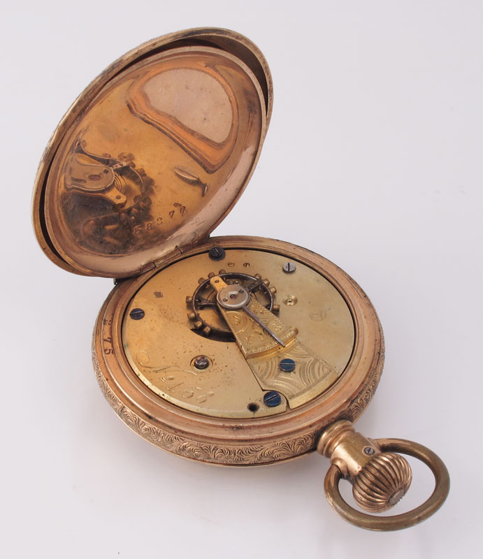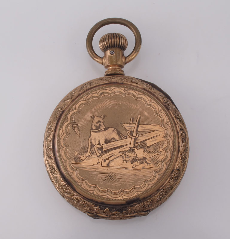 HUNTERS CASE POCKET WATCH CA. 1900: Gold filled British made pocket watch with dog engraved case, serial number 58275. Approx. size 18, 7 jewel movement with serial number 158. Original dial, moon style hands. Not in running order.