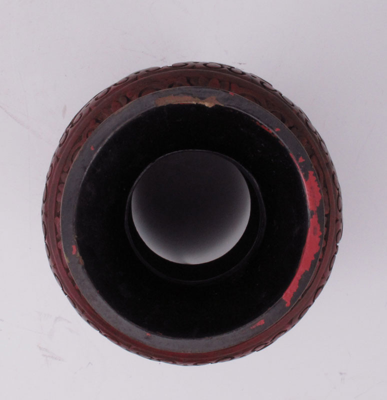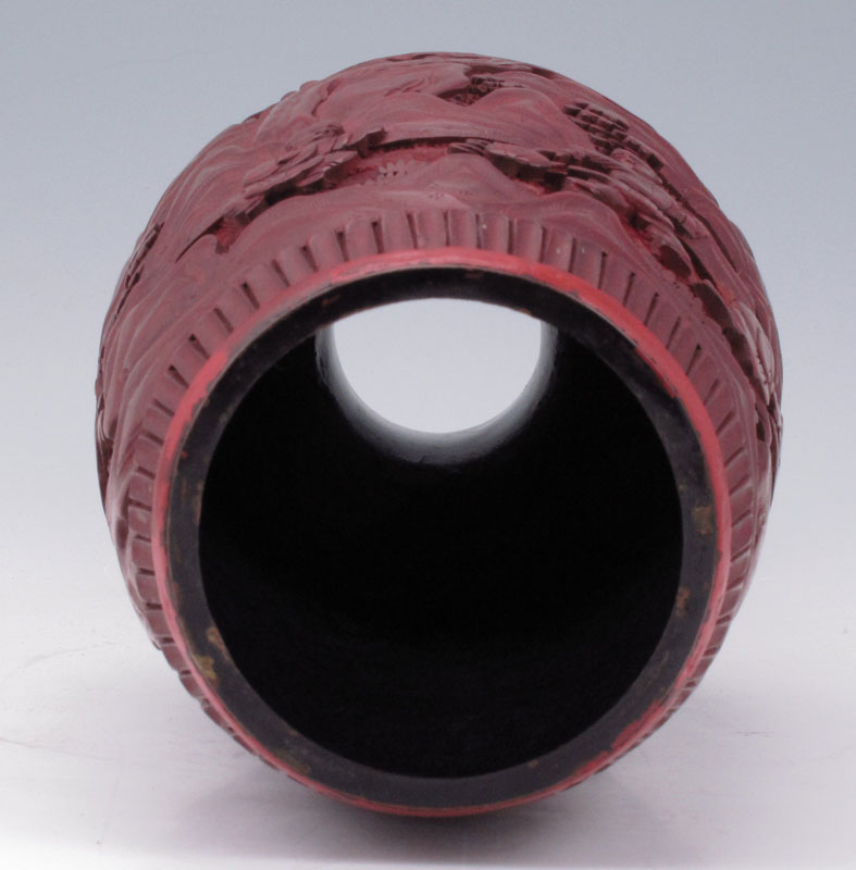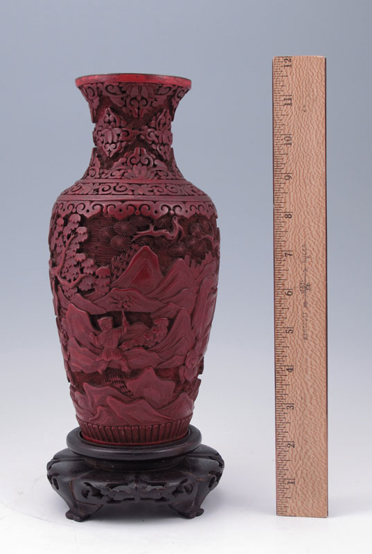 CINNABAR VASE: Carved landscape with figures. Base has been removed for lamp conversion. 9 3'' h. x 4 1/2''. Sold with carved wood base, 2'' h. x 5''.