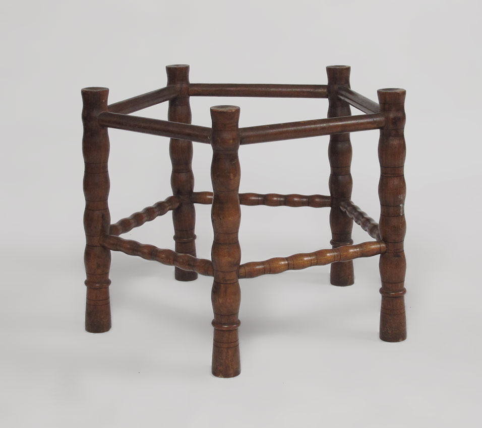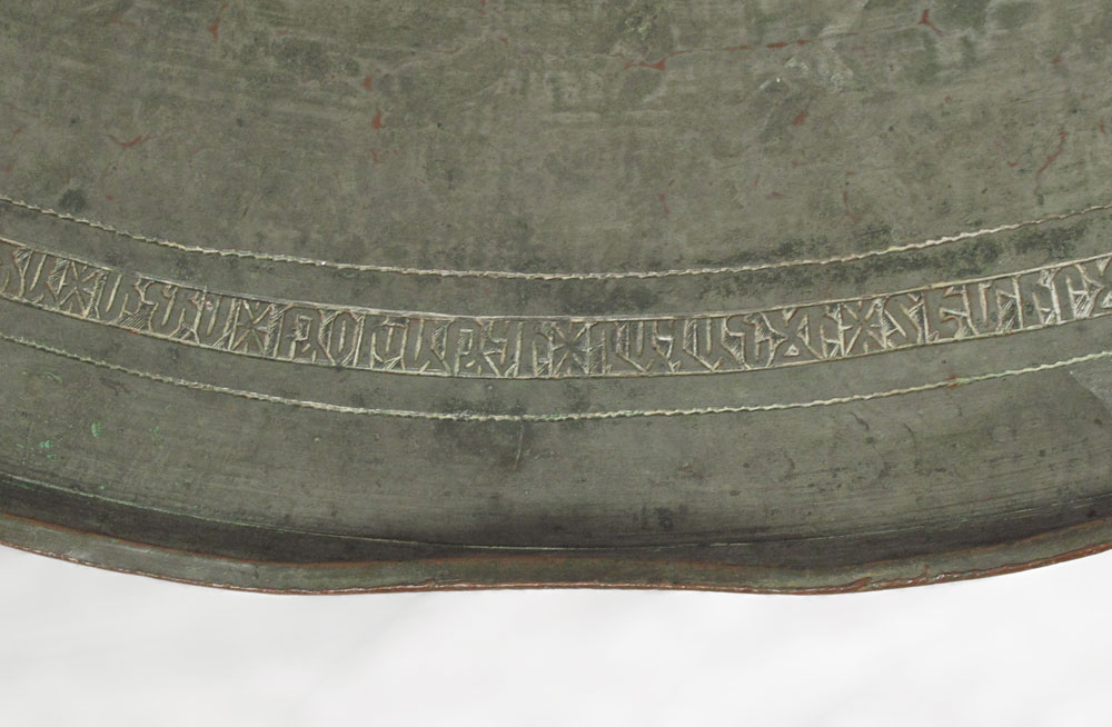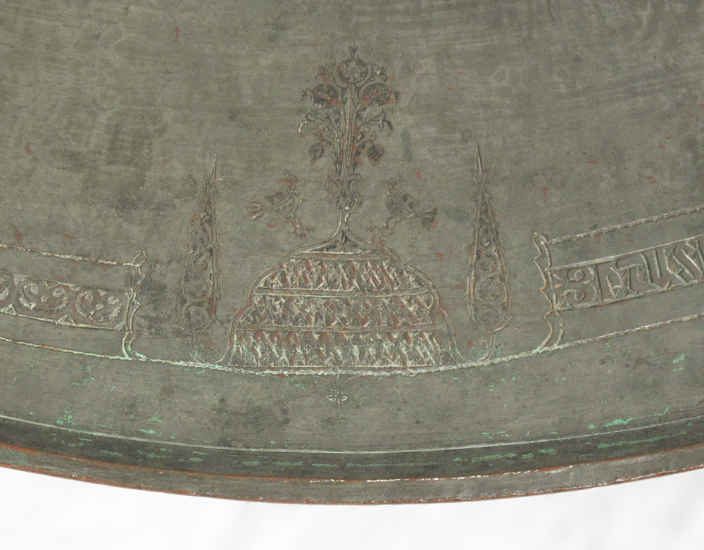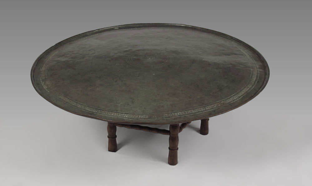 PERSIAN TRAY ON STAND / COFFEE TABLE: Low, circular coffee table made from an antique Persian tray on a four-legged turned stand of Middle Eastern design. 17 3/4''h x 47 1/4''dia
