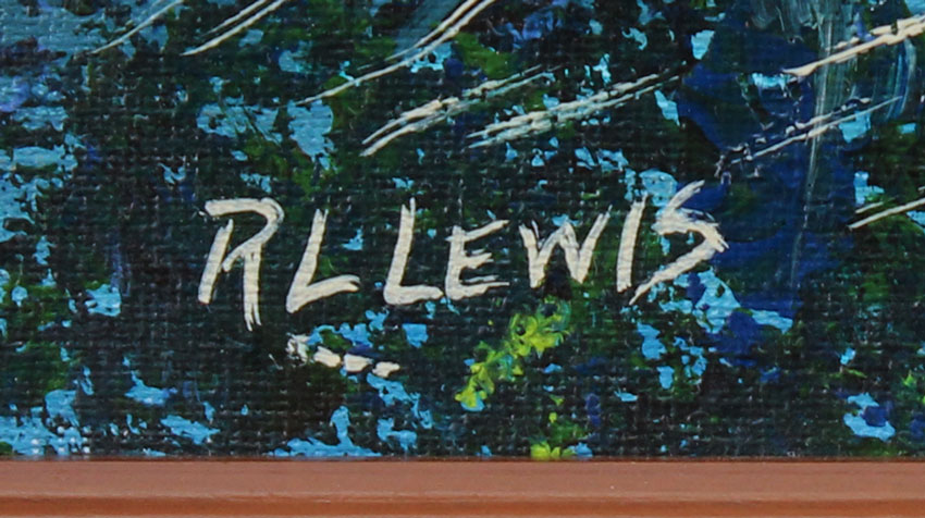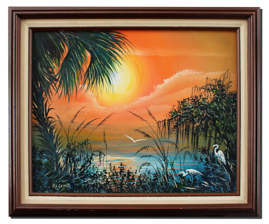LEWIS, Robert Lewis, (American, 20th Century): Florida Highwaymen coastal scene featuring birds and trees, OIL/Canvas, signed front and verso with original R. L. Lewis gallery tag on frame. 16'' x 20'', framed 20 3/4'' x 24 3/4''.