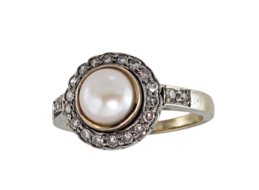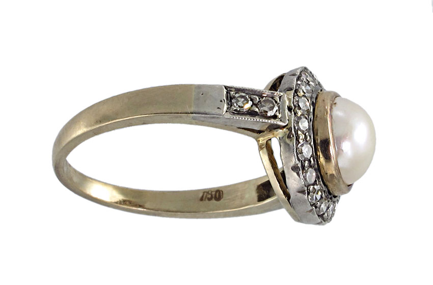 18K GOLD PEARL AND DIAMOND RING: 18K yellow gold ring centering a 5.5mm round pearl framed by 22 round diamonds, approx. .40 Cts. The diamonds are set in sterling. Size 7.5