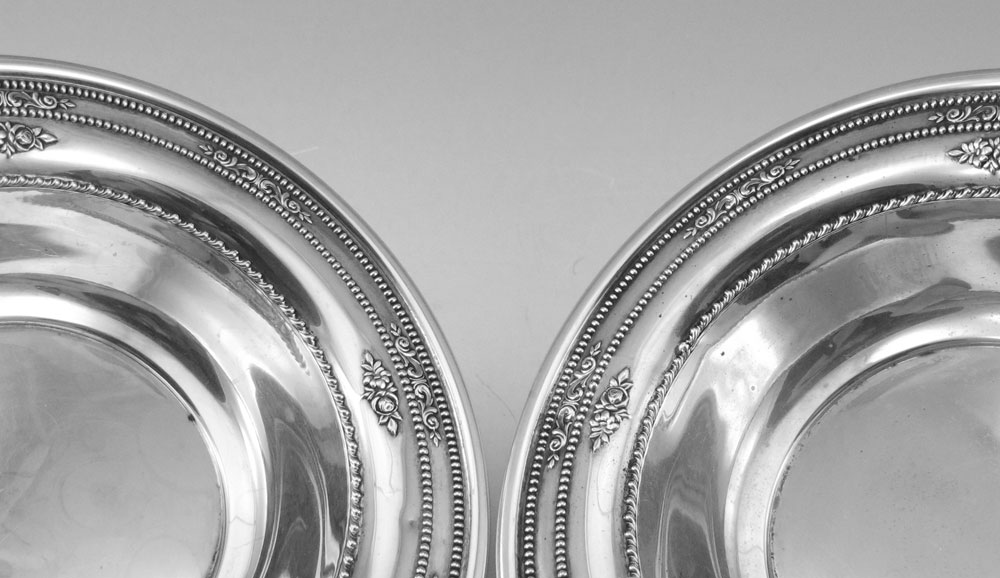 PAIR OF WALLACE STERLING REPOUSSE LOW BOWLS: Repousse floral and foliate scroll design rim, marked Wallace Sterling 4629-9. 1 1/4'' h. x 6 3/8'' dia. Approx. 5.7 troy oz.