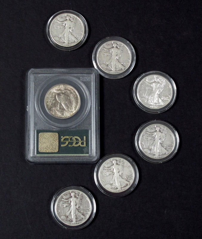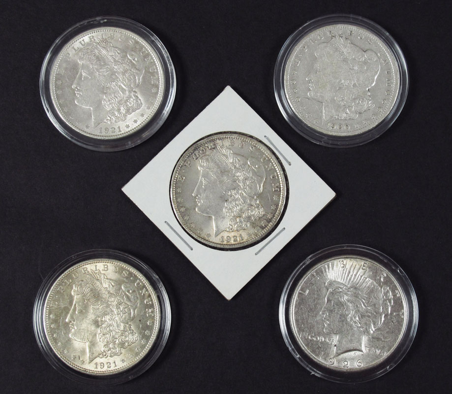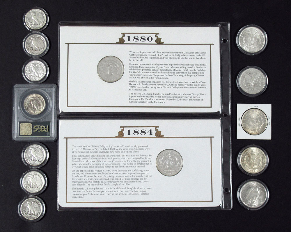 US SILVER COIN COLLECTION OF DOLLARS AND HALF DOLLARS: Lot includes 6 Morgan dollars (1880, 1884, 1900-O, 3 1921), 1926-S Peace dollar, 7 Walking Liberty half dollars (1945-S graded PCGS MS64, 1940, 1942, 1943, 1943-S, 1944, 1945). Ungraded with exception the 1945-S Walking Liberty.