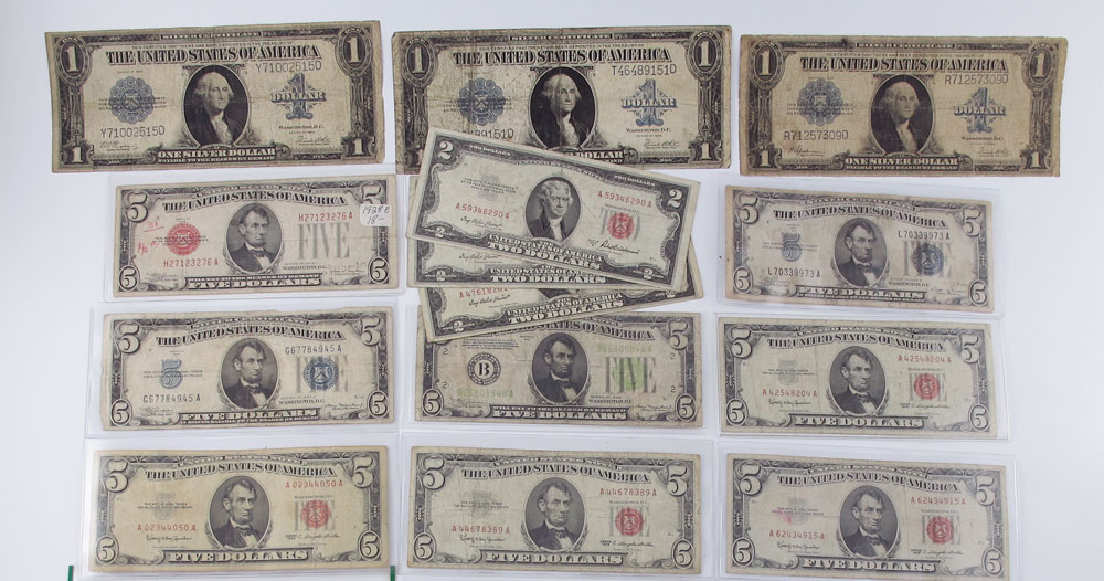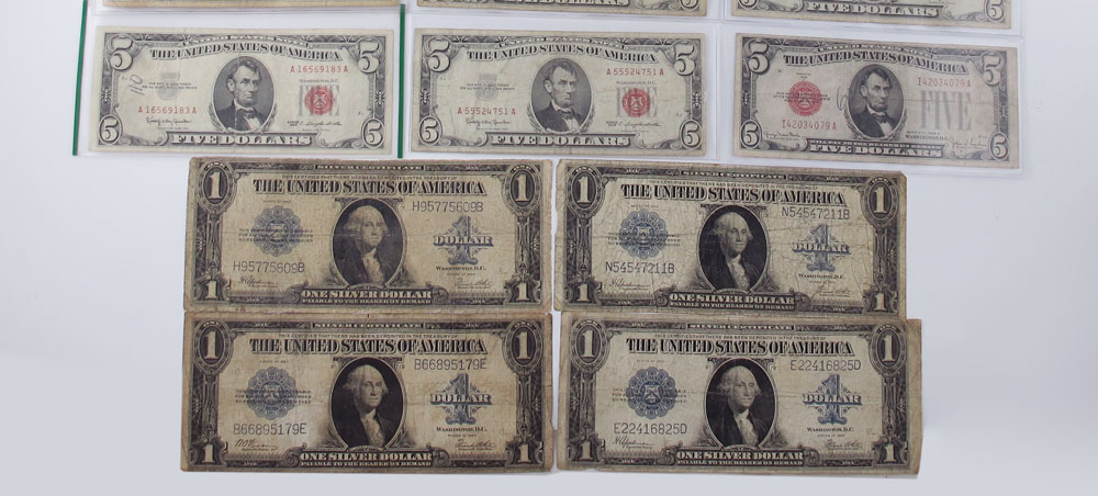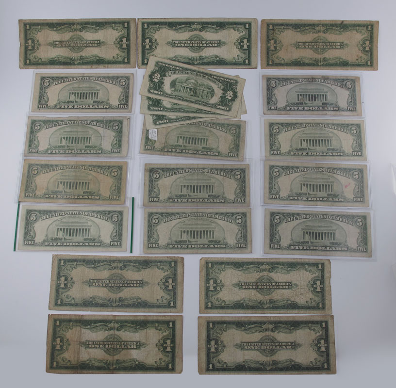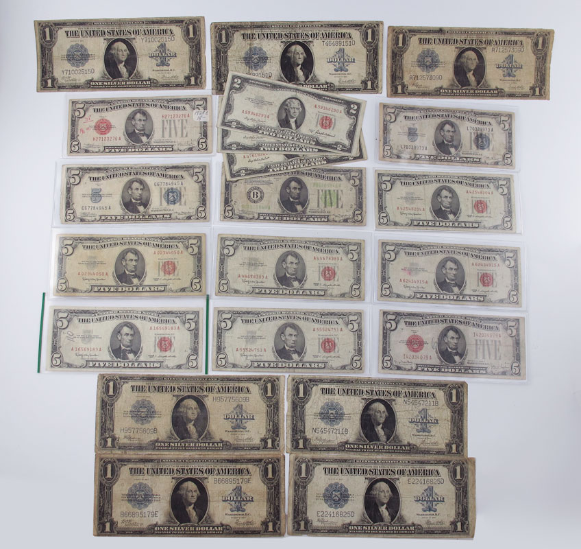 COLLECTION OF US PAPER CURRENCY: Approx. 21 bills to include 1) $5 to include 1928E red seal, 1928F red seal, 1934A blue seal, 1934B blue seal, 1934 light green seal, 6 1963 red seal. 2) $2 to include 3 1953A red seal. 3) $1 silver certificates to include 7 1923 blue seal. All ungraded.