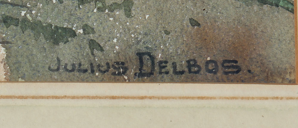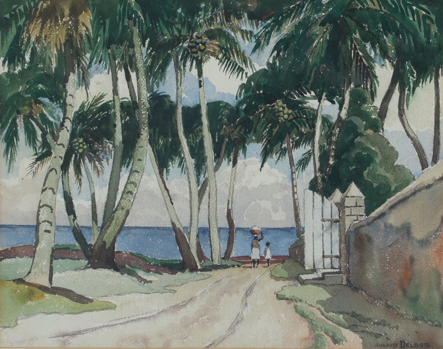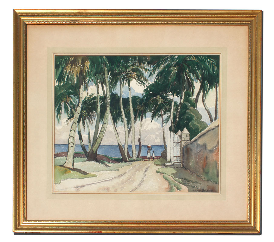 DELBOS, Julius, (American, 1879-1970): Tropical Landscape With Figures Walking Along a Seaside Road, Watercolor, sight size 16'' x 19 1/2'', signed lower right, framed, 25 1/2'' x 29 1/2''.