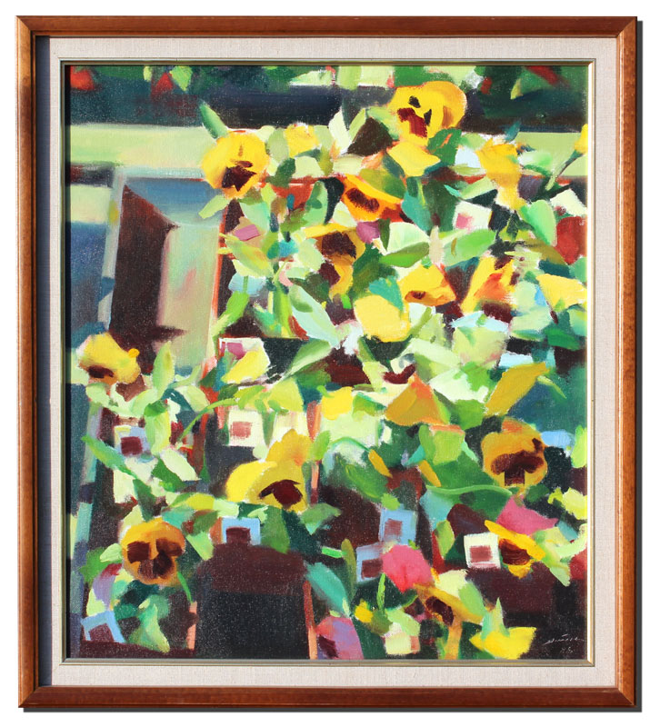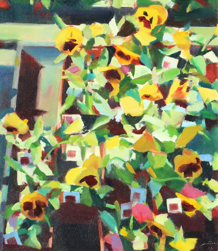 GAVIN, Boyd, (American, 20th C.): ''Pansies #1'', Oil/Canvas, 22'' x 19 1/2'', signed lower right and dated '85, Gump's Gallery San Francisco label affixed verso, framed, 24'' x 21 1/2''.