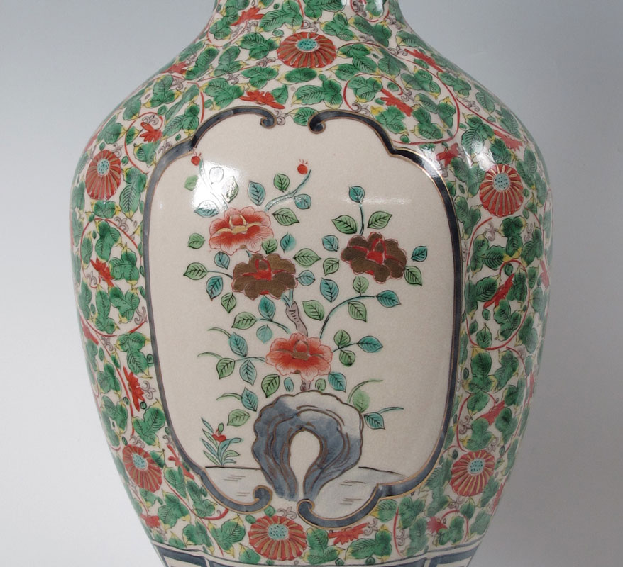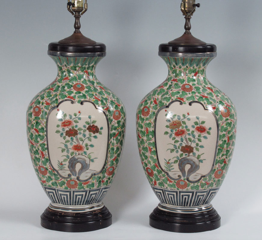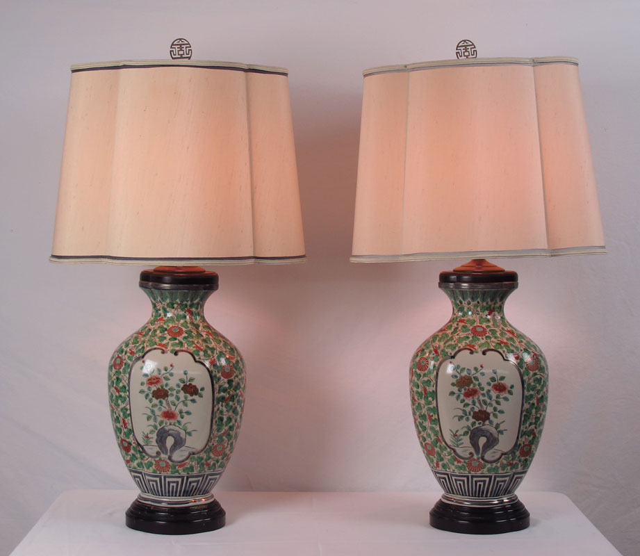 A TALL PAIR OF IMARI PORCELAIN LAMPS: Hand painted, wood bases. The porcelain is 19'' x 11'' x 9'', lamps are 39'' overall. Sold with the lobed shades.