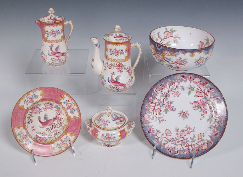 MINTON BREAKFAST SET IN THE COCKATRICE PATTERN: Pattern #9646. Coffee pot, 6 1/2'', covered cream pitcher, 6'', covered sugar and a cereal bowl, 6 1/2'' dia. Sold with French Utzschneider Sarreguemines 6 1/2'' bowl and 7 1/2'' plate.