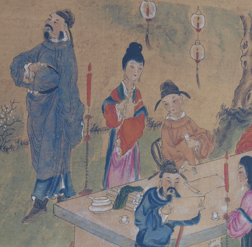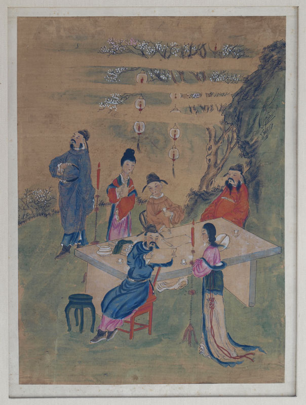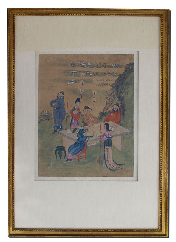 EARLY CHINESE WATERCOLOR ON PAPER DEPICTING FIGURES SEATED AROUND A TABLE: Image size 17'' x 12 1/2'', framed 32'' x 21 1/2''.