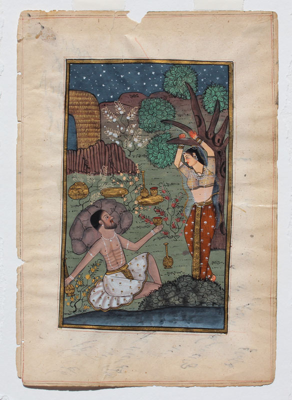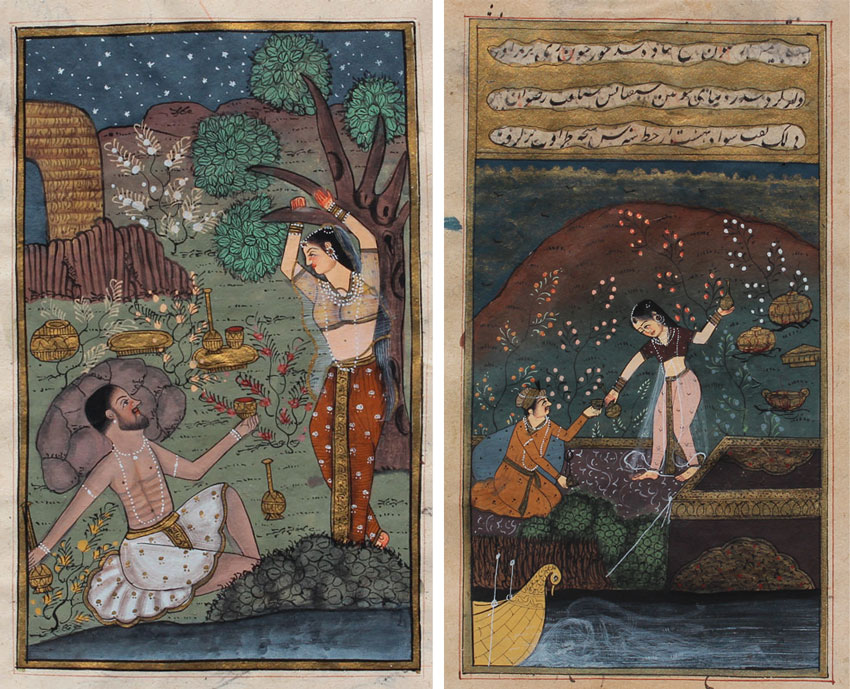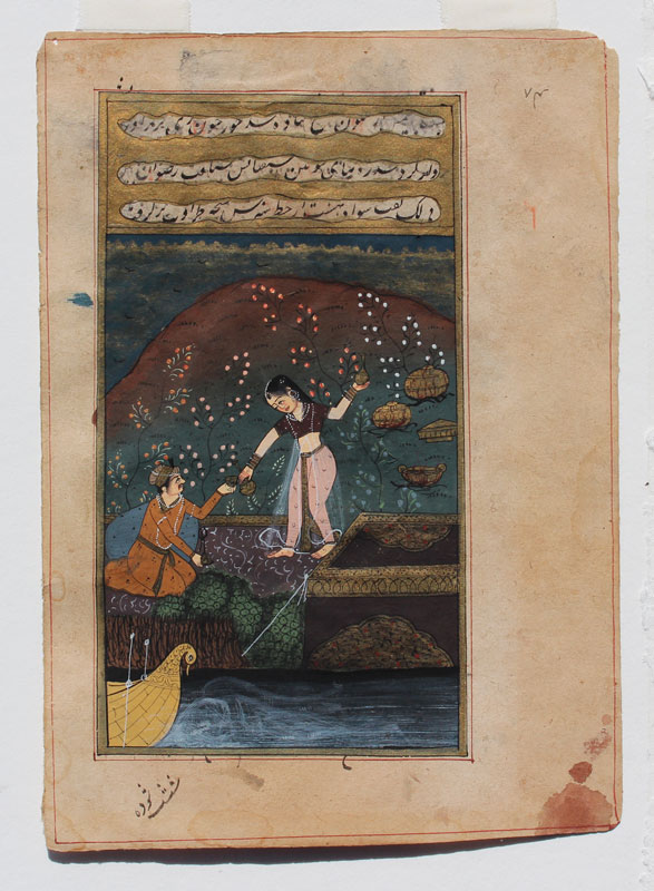 PAIR OF 19th C PERSIAN GOUACHE PAINTINGS: Both scenes depict lovers in landscapes, indiscernible inscriptions both on the front and back, hinge mounted, approximately 9 3/4'' x 6 1/2'', fine archival framing, 14 1/4'' x 10''.