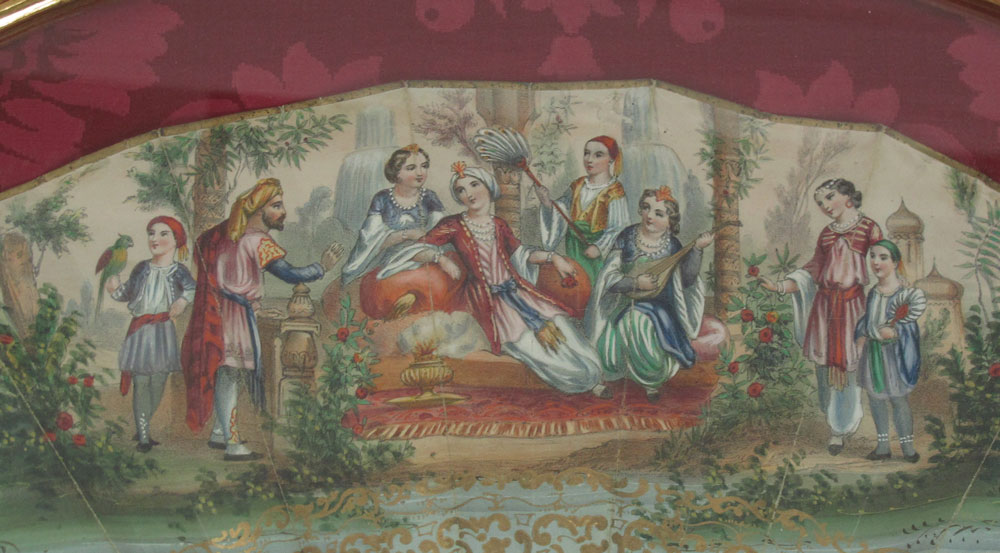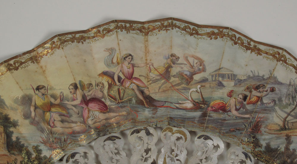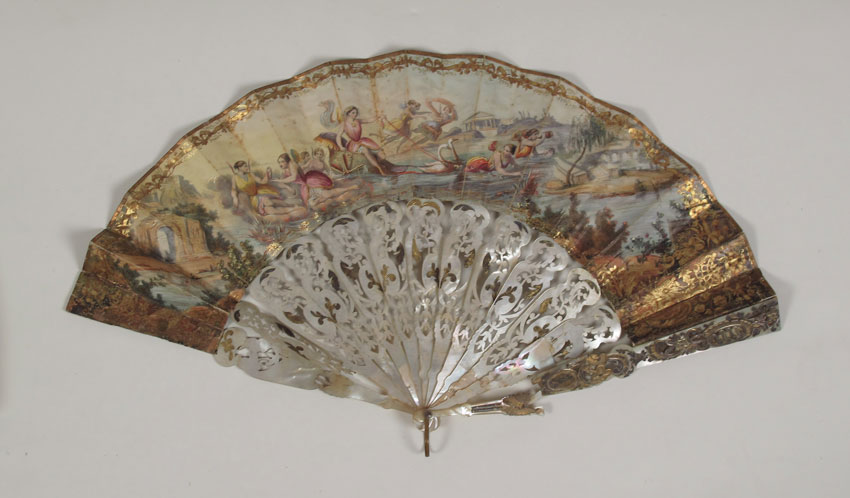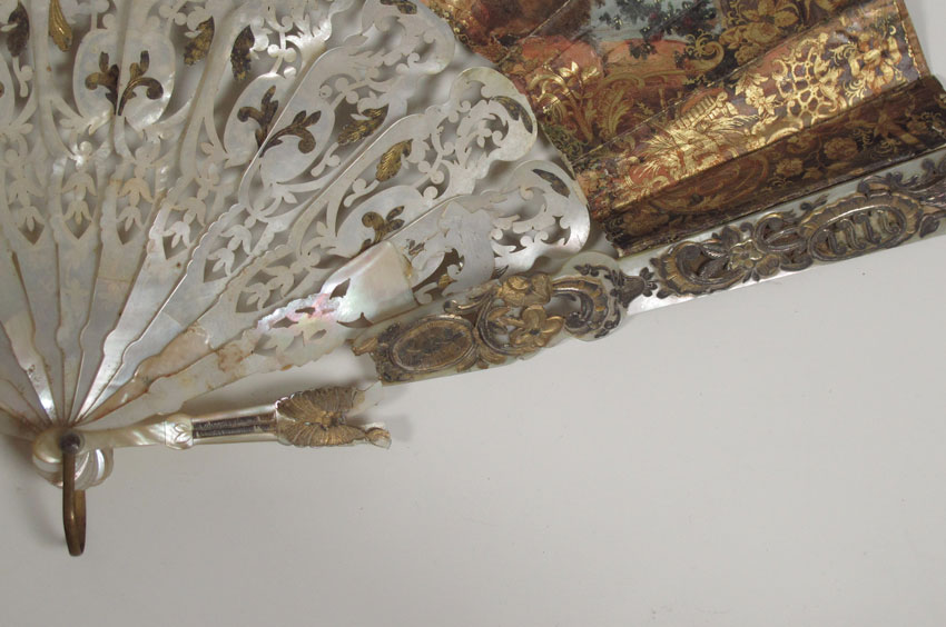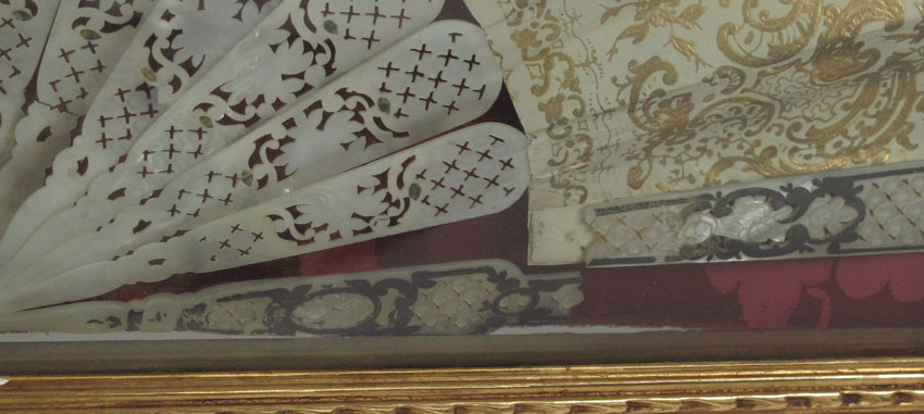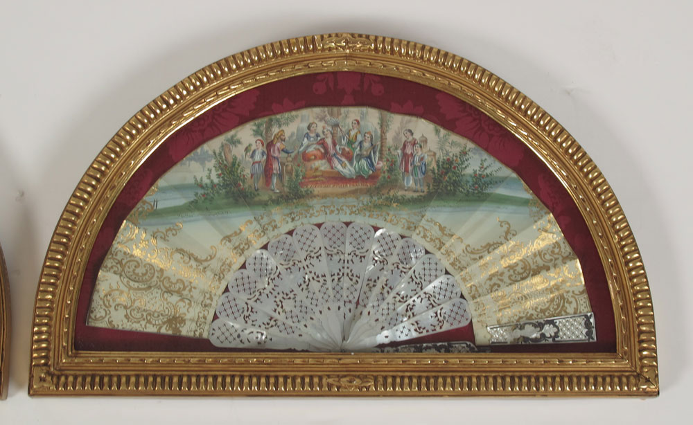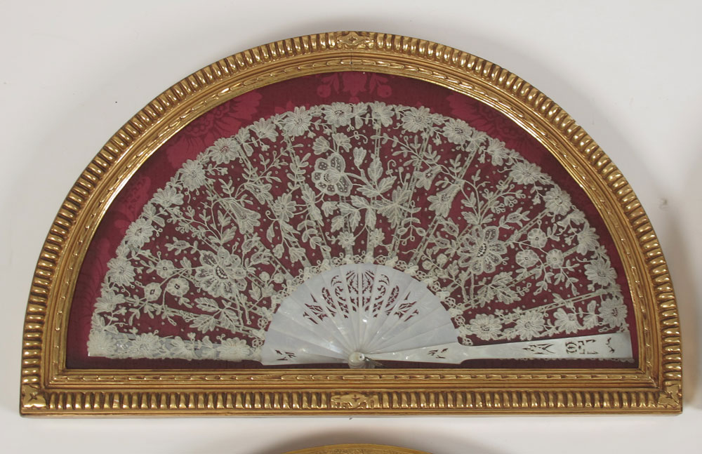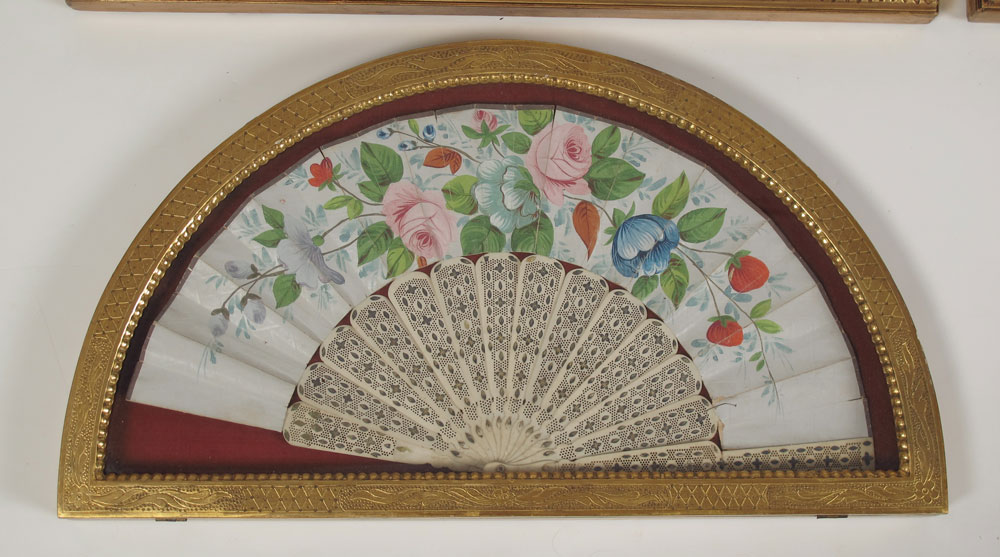 GROUP OF 4 HAND PAINTED OR LACE FANS: Mother of pearl and hand painted fan (2 broken fingers), 19'' x 10''. 3 fans in gilt wood frames. One is ivory with roses, the other two are mother of pearl and paintings. Frames measure 24'' x 14'' and 23'' x 12 1/2''.