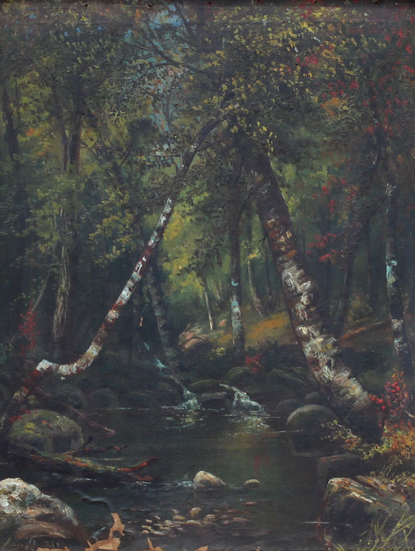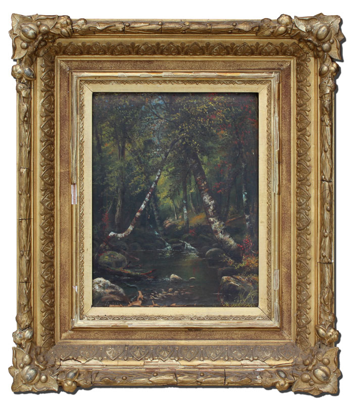 19TH C. AMERICAN SCHOOL OIL/CANVAS WOOD STREAM SCENE: 12'' x 10'', encased in period gilded and carved leaf and foliate motif frame with wear and missing gesso, 21'' x 17 1/2'', faintly signed lower left.