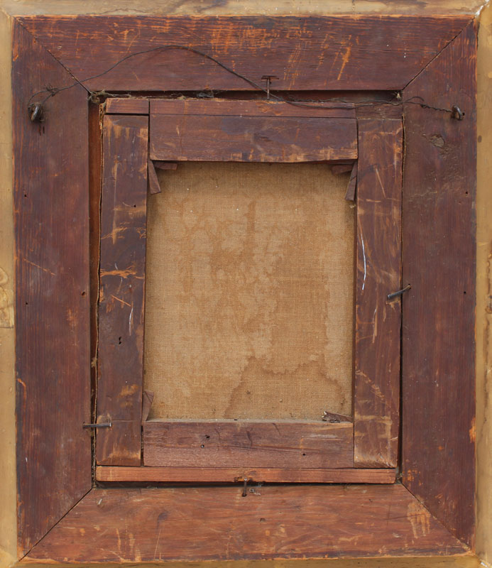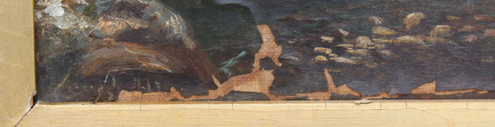 CONDITION: Needs cleaning, moisture damage has caused paint fleck in lower margin, some minor cracklure in upper portion of the painting.