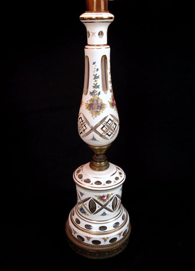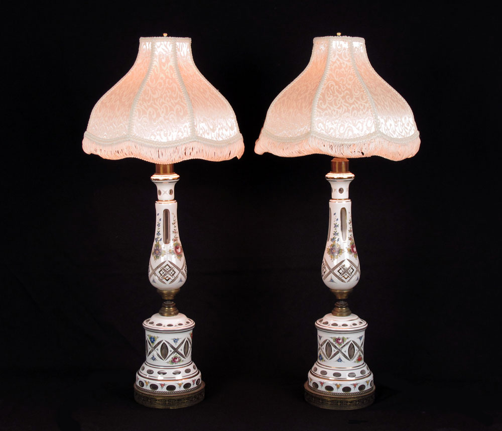 PAIR BOHEMIAN CUT TO CLEAR TABLE LAMPS: White cut to clear with hand painted flowers, reticulated brass base. Later fringe shades. 35'' tall overall.