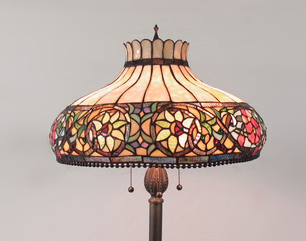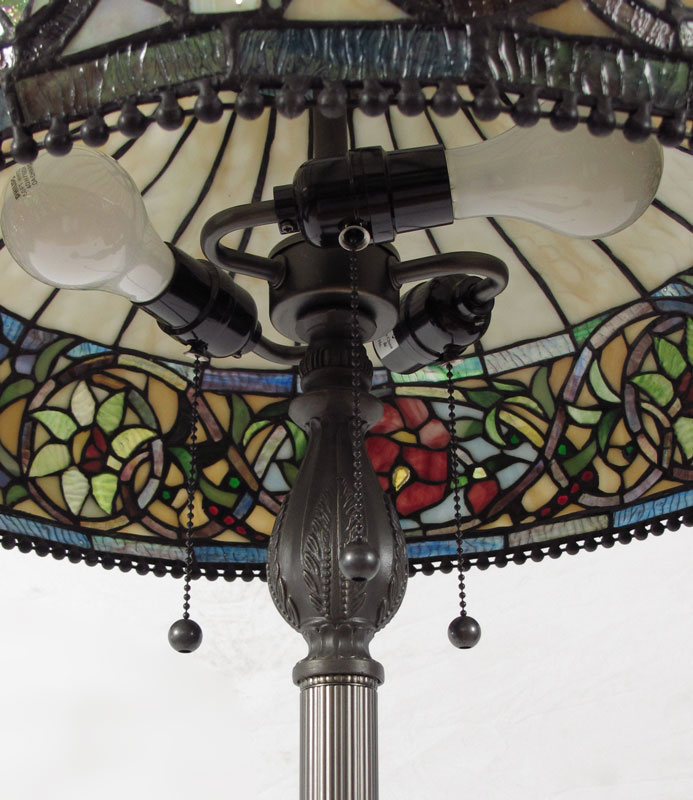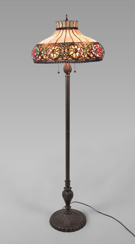 CONTEMPORARY STAINED GLASS FLOOR LAMP: Cast metal base with floral and caramel slag shade with bits of iridescent. Base 63 1/2'' h. x 12'' base dia., shade 10 3/4'' h. x 20'' dia.