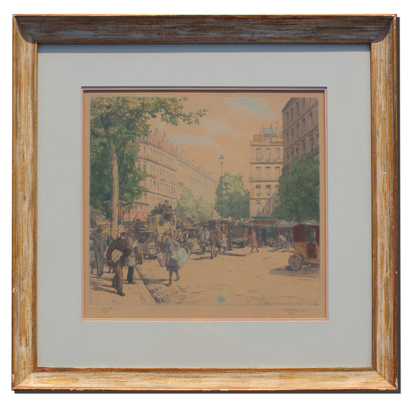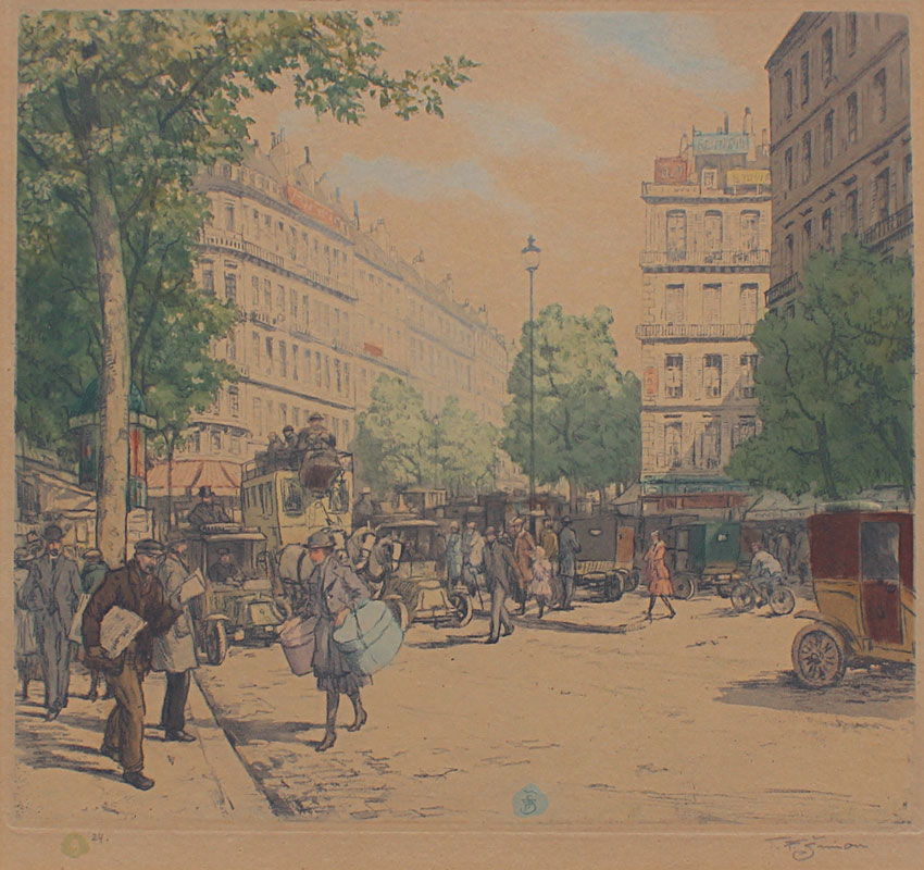 SIMON, Tavik Frantisek, (Czech, 1877-1942): Parisian Street Scene, Etching and Aquatint, sight size 14'' x 15 1/2'', pencil signed lower right, artist's cipher in the plate and in the lower left margin, numbered 24, framed, 23 1/2'' x 24 1/2''.