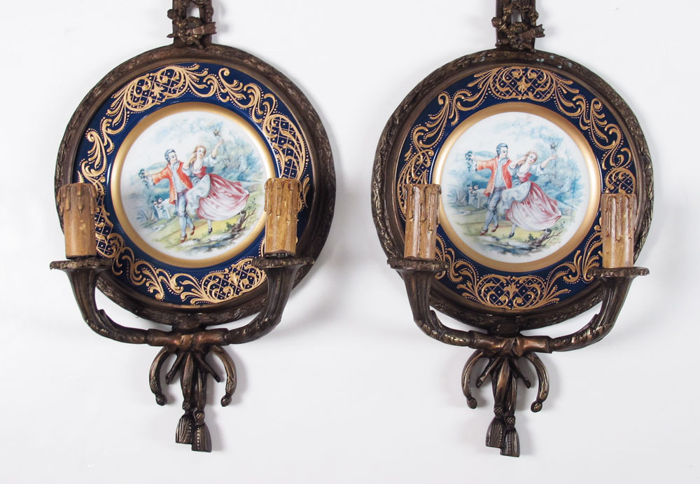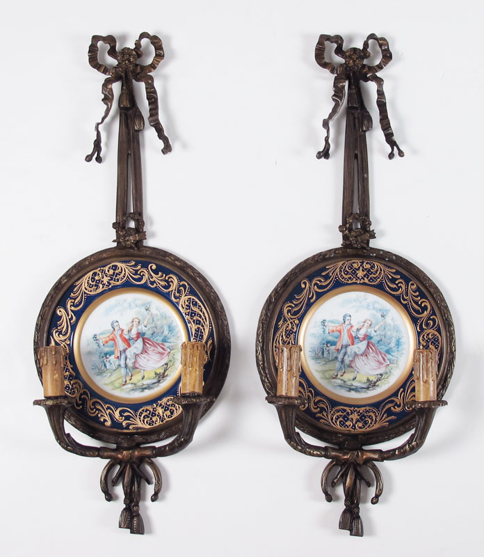 PAIR FRENCH STYLE BRONZE SCONCES WITH PLATES: Electric decorative pair of 2 light sconces with inset transfer decorated plates. Sconces unsigned. 31 1/4'' h. x 12 1/2'' x 4 1/2''.