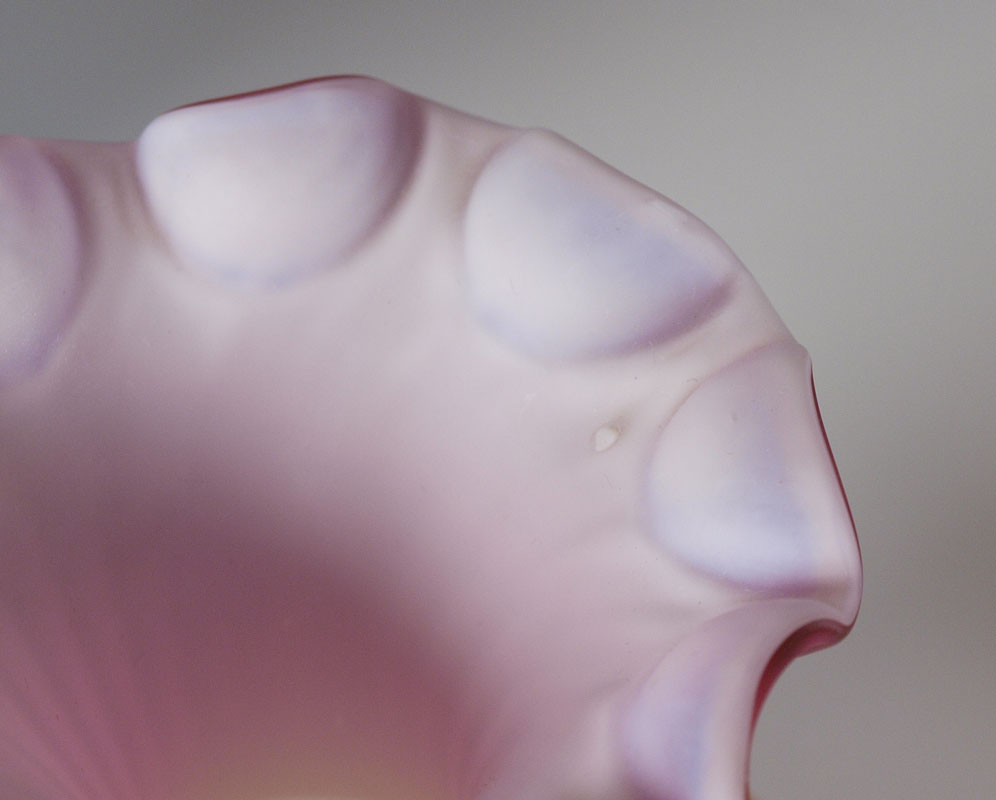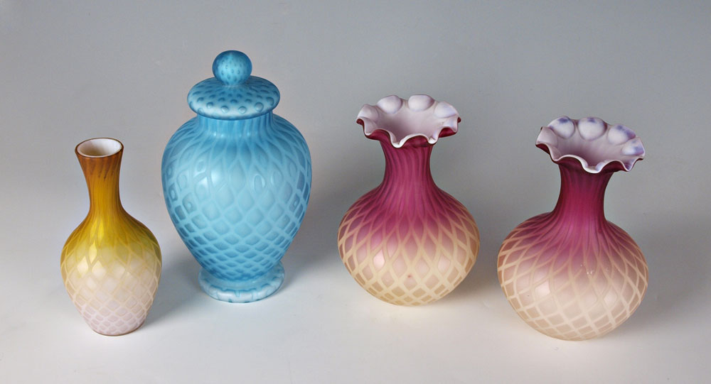 SATIN QUILTED OPALESCENT GLASSWARE: 4 piece lot to include the blue covered jar, 9 1/2''h. Pair of cranberry ruffle rim vases, 8'', and an amber vase, 7 1/2'' tall.