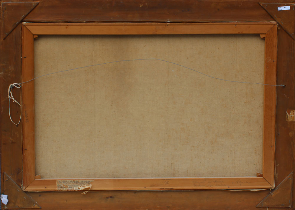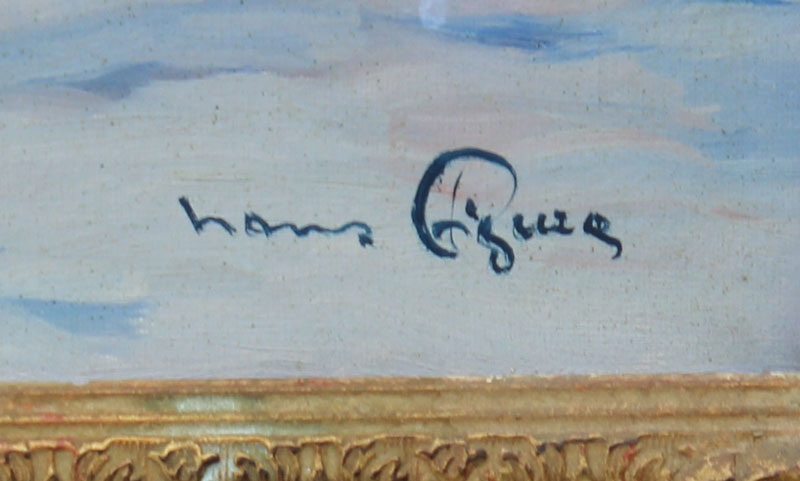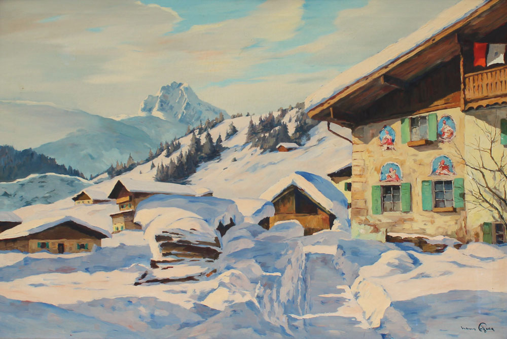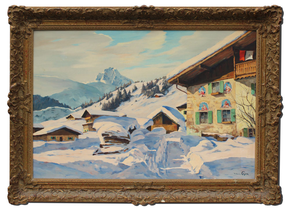 FIGURA, Hans, (Austria, 1898-): Alpine Snow Covered Village, Oil/Canvas, 24'' x 36'', signed lower left, encased in period gilded and carved gesso frame with minor wear, 32'' x 45''.
