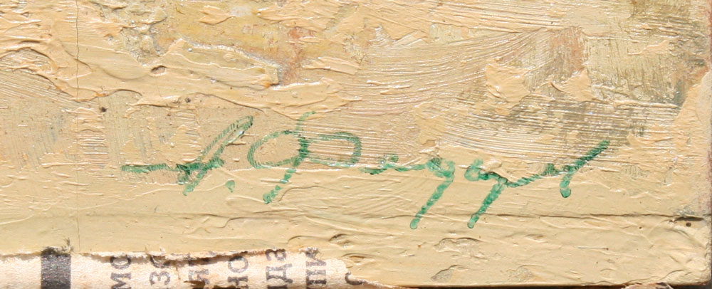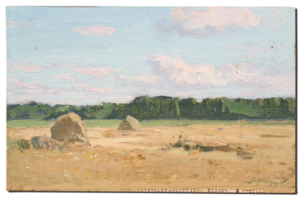 ILLEGIBLY SIGNED RUSSIAN LANDSCAPE HAY HARVEST: Oil/Board, 6 1/2'' x 10'', signed lower right, also signed verso, framed without glass, 11 3/8'' x 14 1/2''.