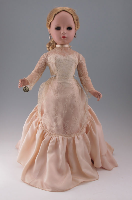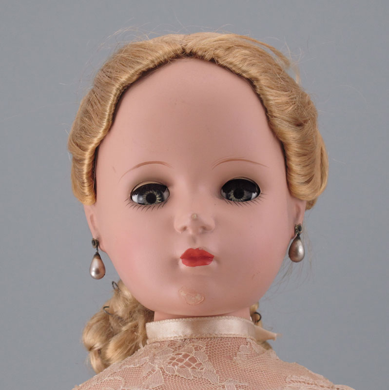 VINTAGE HARD PLASTIC MADAME ALEXANDER DOLL: In original lace trimmed dress and dangle earrings. No shoes. Fashion Academy Award paper tag. Sleepy gray eyes. Approx. 19'' tall.