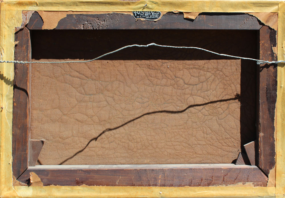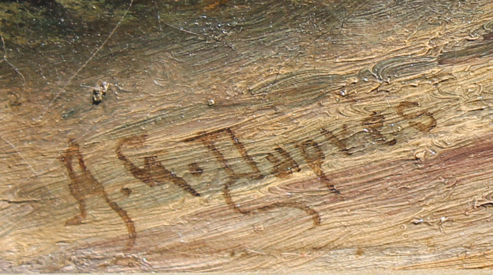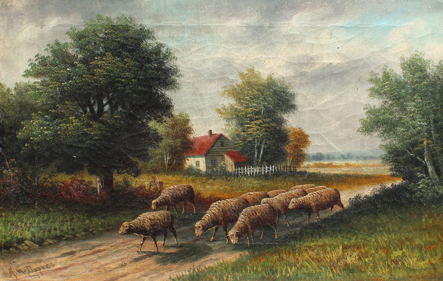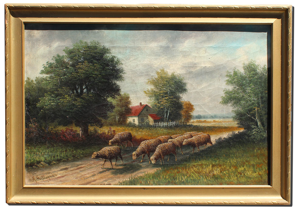 19TH C LANDSCAPE PAINTING WITH SHEEP: Oil/Canvas, signed A.G. Dupres, depicts sheep travelling along a dirt road, with cottage in the background, painted gold frame, 14 1/2'' x 20 1/2''.