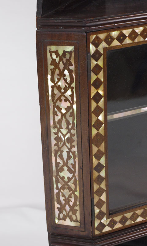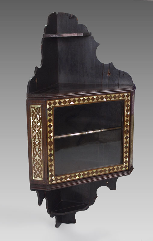 MOTHER OF PEARL INLAY CORNER CABINET: Mother of pearl inlay on door trim and side panels. Shelf above and below door. 33 1/4'' h. x 19 1/2'' x 10''