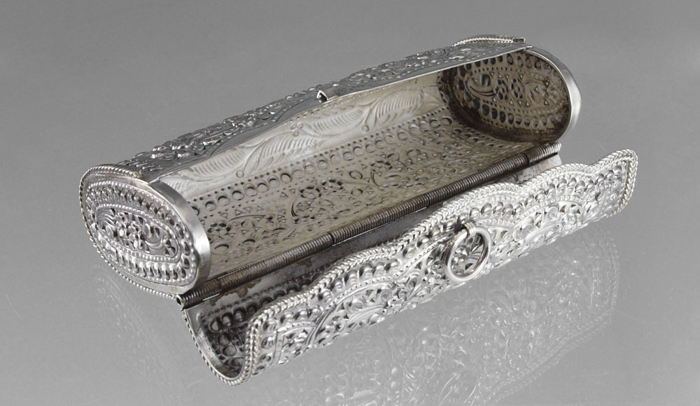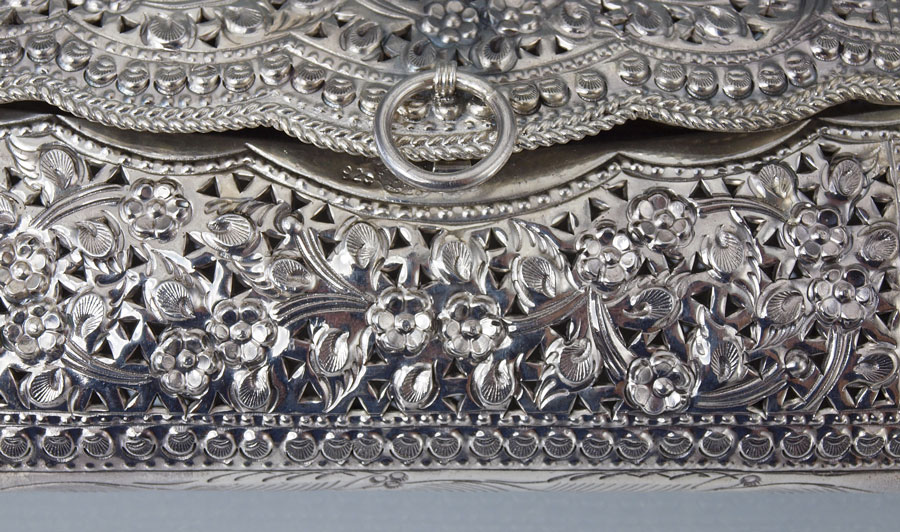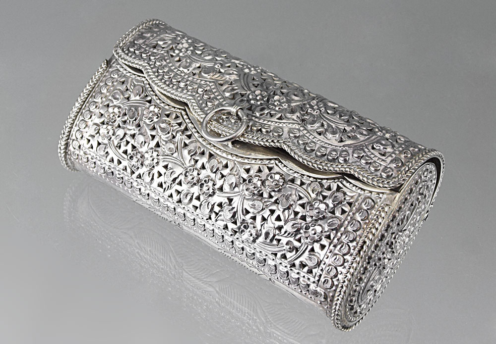 RETICULATED AND FLORAL EMBOSSED STERLING PURSE: Floral design embossed with pierce work and engraved accents. Hinged top. Simply marked 925. 2 1/4'' h. x 4 1/2'' x 1 1/4''. Approx. 3.9 troy oz.