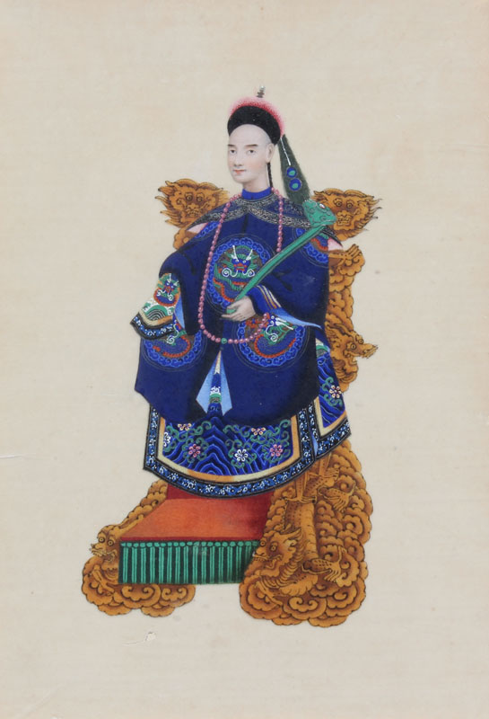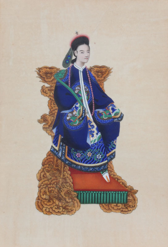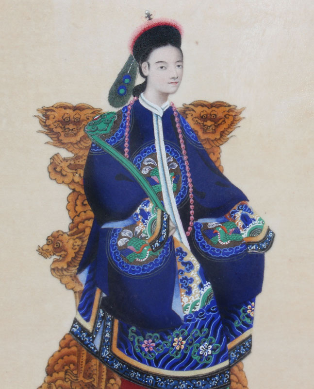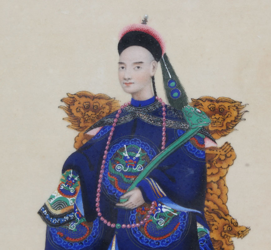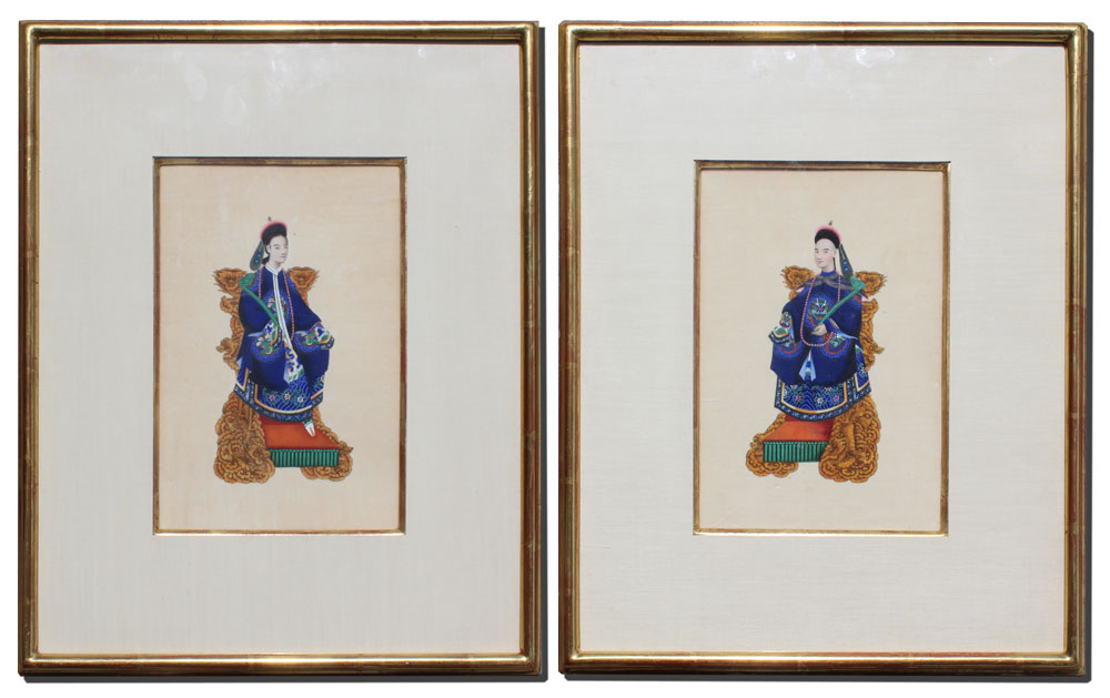 PAIR OF 19TH C. CHINESE ANCESTRAL WATERCOLORS ON SILK: Depicting husband in one framed image and wife in the other, sight size 10'' x 6 3/4'', exceptional detail, professionally framed in a gold leaf molding with minor wear, 18 1/2'' x 15''.