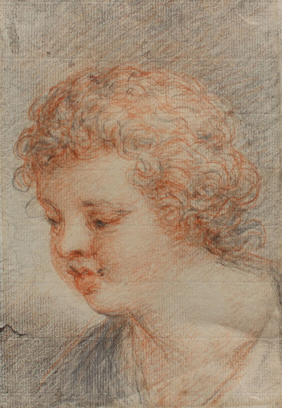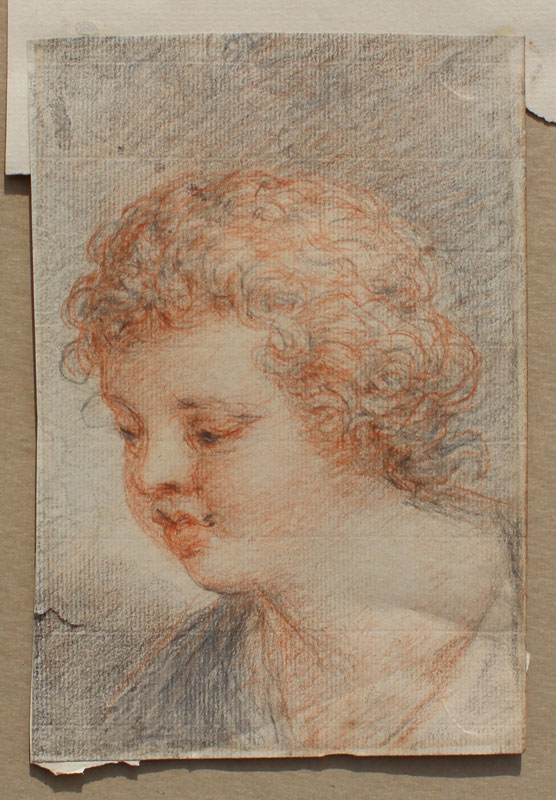 19TH C. OR EARLIER STUDY OF A CHILD'S HEAD ATTRIBUTED TO CIPRIANI: Pencil Drawing, measures 7'' x 5'' on laid paper with partial watermark visible, top corners are glued to backing paper, framed, 14'' x 11''. Small tear in left margin, glue and paper remnants affixed verso, sold as is.