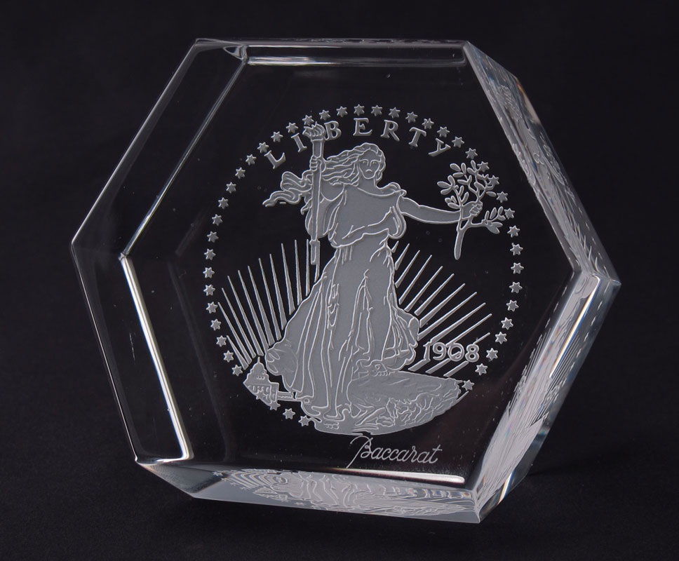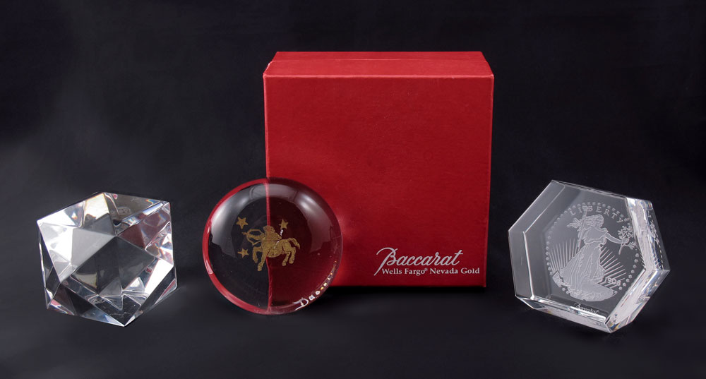 GROUP OF 3 FRENCH BACCARAT CRYSTAL PAPERWEIGHTS: 1) Intaglio cut Walking Liberty coin, 3'', in the original box. 20 Many facets, 3''. 3) Sagittarius, 3 1/4''.