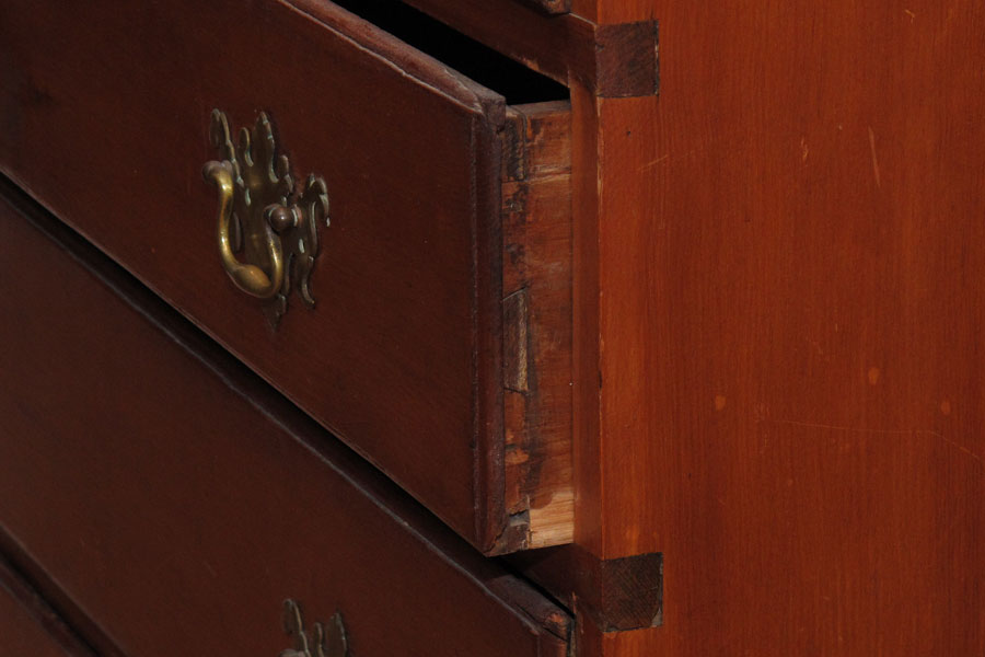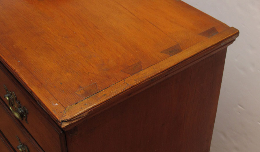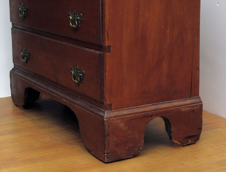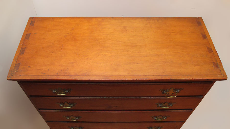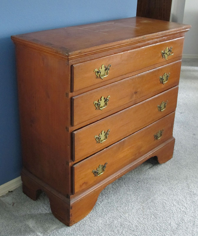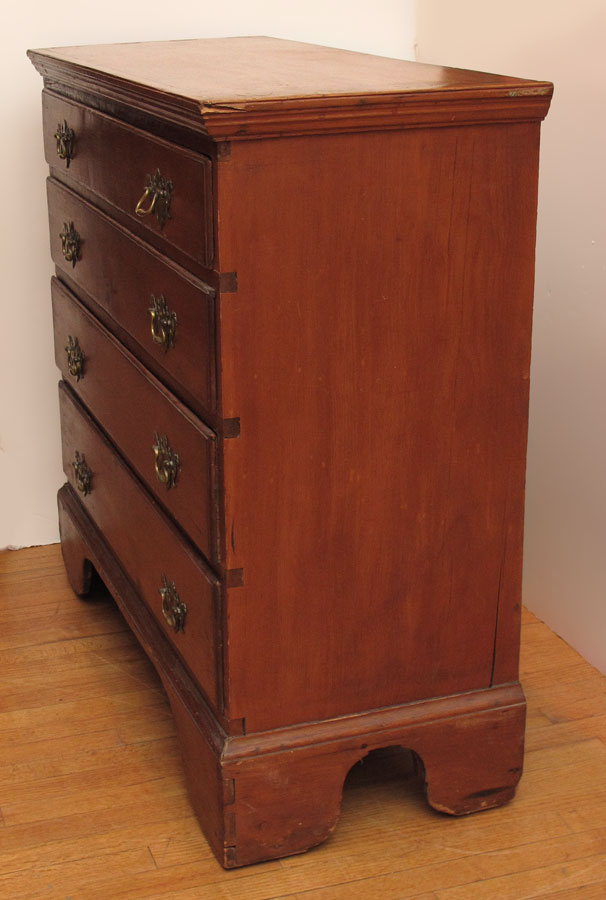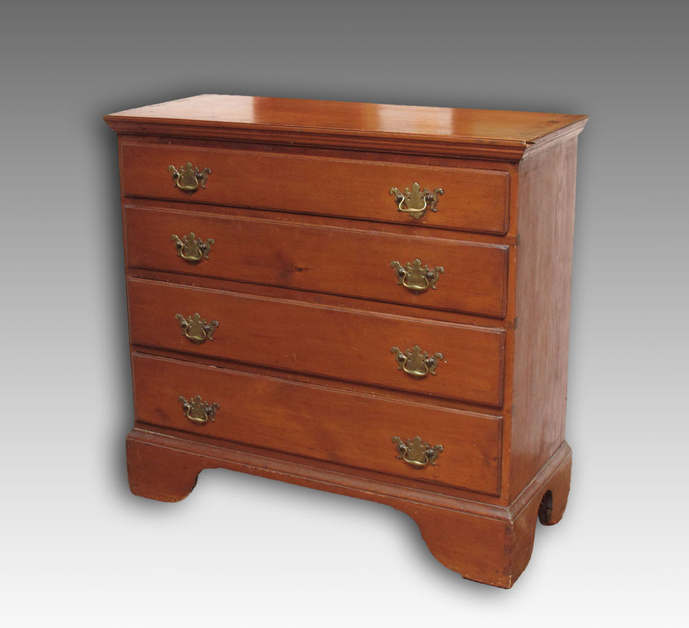 AMERICAN COUNTRY CHIPPENDALE CHEST OF DRAWERS: New England, primarily cherry, 4 drawers, bracket feet. Visible large dovetails to the top. Measures approx. 41'' x 43 1/2'' x 18''.